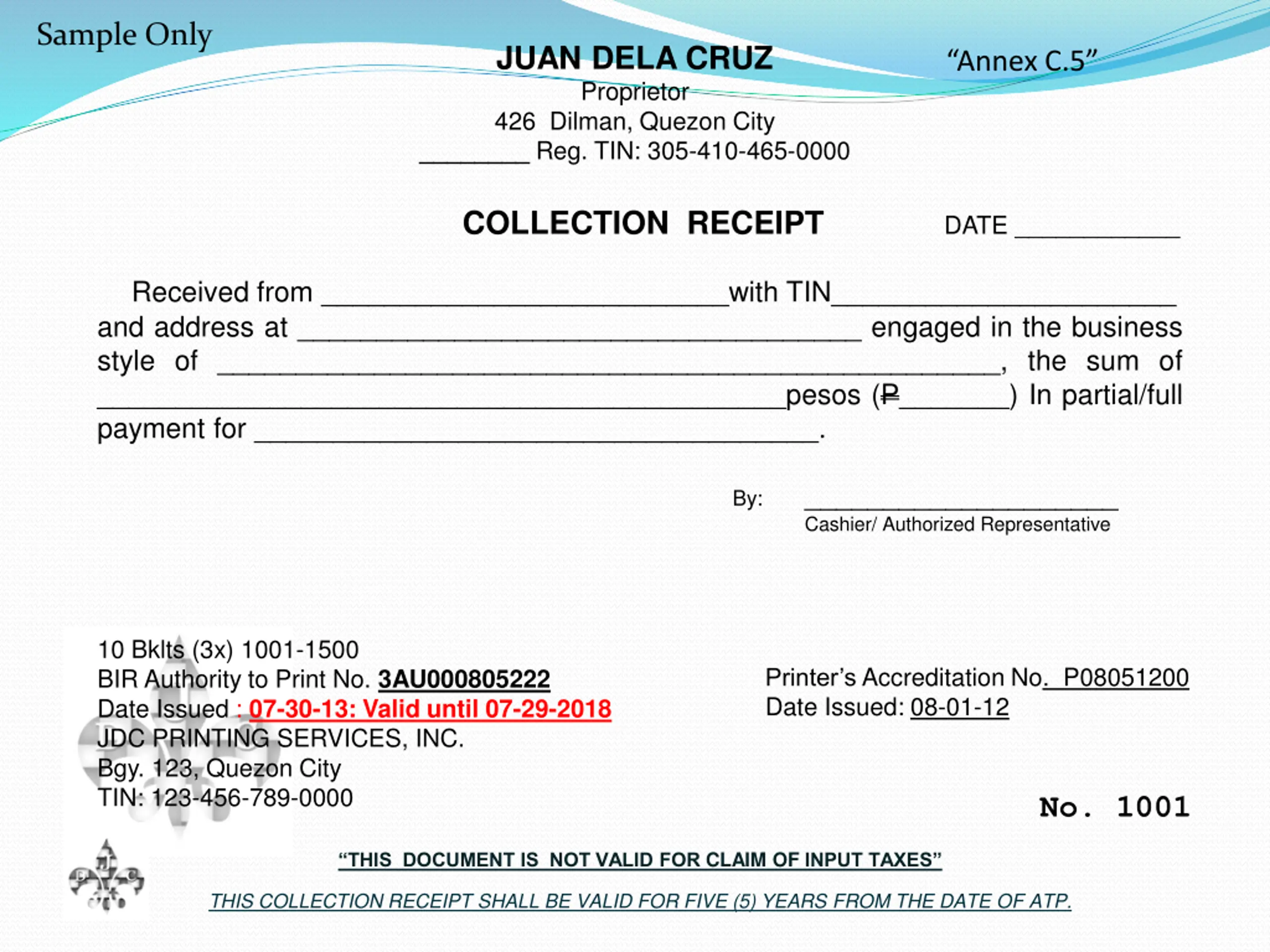 Sample Only JUAN DELA CRUZ Proprietor 426 Dilman, Quezon City ________ Reg. TIN: 305-410-465-0000 Annex C.5 COLLECTION RECEIPT DATE ____________ Received from __________________________with TIN______________________ and address at ____________________________________ engaged in the business style of __________________________________________________, the sum of ____________________________________________pesos (P_______) In partial/full payment for ____________________________________. ____________________ Cashier/ Authorized Representative By: 10 Bklts (3x) 1001-1500 BIR Authority to Print No. 3AU000805222 Date Issued : 07-30-13: Valid until 07-29-2018 JDC PRINTING SERVICES, INC. Bgy. 123, Quezon City TIN: 123-456-789-0000 Printer s Accreditation No. P08051200 Date Issued: 08-01-12 No. 1001 THIS DOCUMENT IS NOT VALID FOR CLAIM OF INPUT TAXES THIS COLLECTION RECEIPT SHALL BE VALID FOR FIVE (5) YEARS FROM THE DATE OF ATP.
