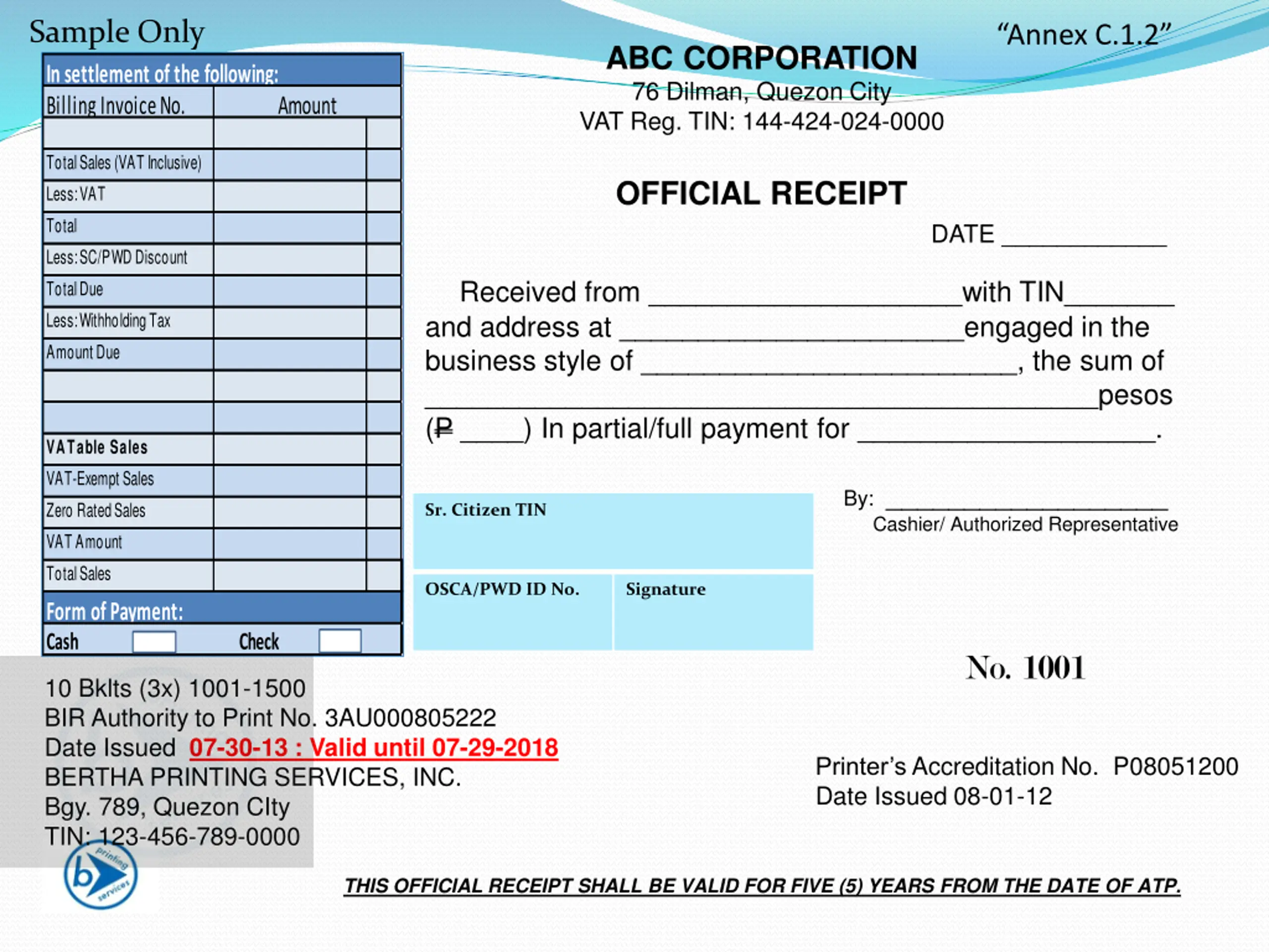 Sample Only Annex C.1.2 ABC CORPORATION 76 Dilman, Quezon City VAT Reg. TIN: 144-424-024-0000 In settlement of the following: Billing Invoice No. Amount Total Sales (VAT Inclusive) OFFICIAL RECEIPT Less: VAT DATE ____________ Total Less: SC/PWD Discount Received from ____________________with TIN_______ and address at ______________________engaged in the business style of ________________________, the sum of ___________________________________________pesos (P ____) In partial/full payment for ___________________. Total Due Less: Withholding Tax Amount Due VATable Sales VAT-Exempt Sales By: __________________ Cashier/ Authorized Representative Zero Rated Sales Sr. Citizen TIN VAT Amount Total Sales OSCA/PWD ID No. Signature Form of Payment: Cash Check No. 1001 10 Bklts (3x) 1001-1500 BIR Authority to Print No. 3AU000805222 Date Issued 07-30-13 : Valid until 07-29-2018 BERTHA PRINTING SERVICES, INC. Bgy. 789, Quezon CIty TIN: 123-456-789-0000 Printer s Accreditation No. P08051200 Date Issued 08-01-12 THIS OFFICIAL RECEIPT SHALL BE VALID FOR FIVE (5) YEARS FROM THE DATE OF ATP.