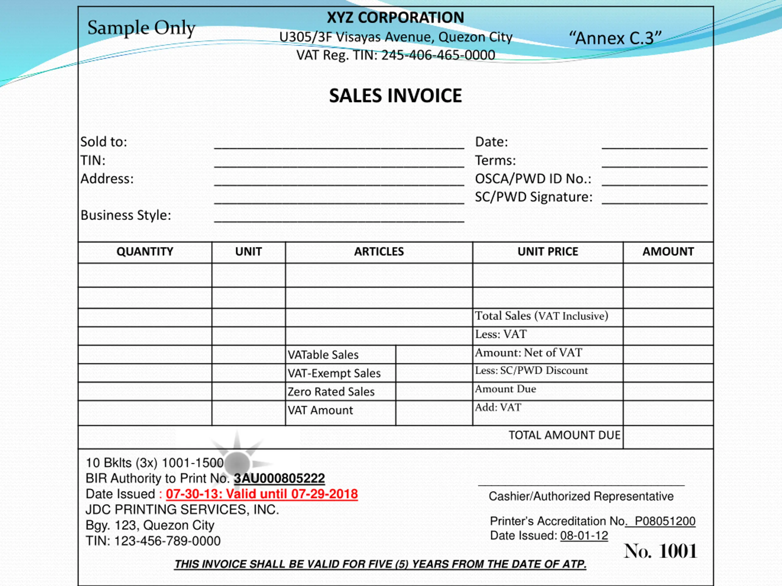 XYZ CORPORATION U305/3F Visayas Avenue, Quezon City VAT Reg. TIN: 245-406-465-0000 Sample Only Annex C.3 SALES INVOICE Sold to: TIN: Address: _________________________________ Date: _________________________________ _________________________________ _________________________________ _________________________________ ______________ ______________ ______________ ______________ Terms: OSCA/PWD ID No.: SC/PWD Signature: Business Style: QUANTITY UNIT ARTICLES UNIT PRICE AMOUNT Total Sales (VAT Inclusive) Less: VAT Amount: Net of VAT VATable Sales VAT-Exempt Sales Zero Rated Sales VAT Amount Less: SC/PWD Discount Amount Due Add: VAT TOTAL AMOUNT DUE 10 Bklts (3x) 1001-1500 BIR Authority to Print No. 3AU000805222 Date Issued : 07-30-13: Valid until 07-29-2018 JDC PRINTING SERVICES, INC. Bgy. 123, Quezon City TIN: 123-456-789-0000 _______________________________ Cashier/Authorized Representative Printer s Accreditation No. P08051200 Date Issued: 08-01-12 No. 1001 THIS INVOICE SHALL BE VALID FOR FIVE (5) YEARS FROM THE DATE OF ATP.