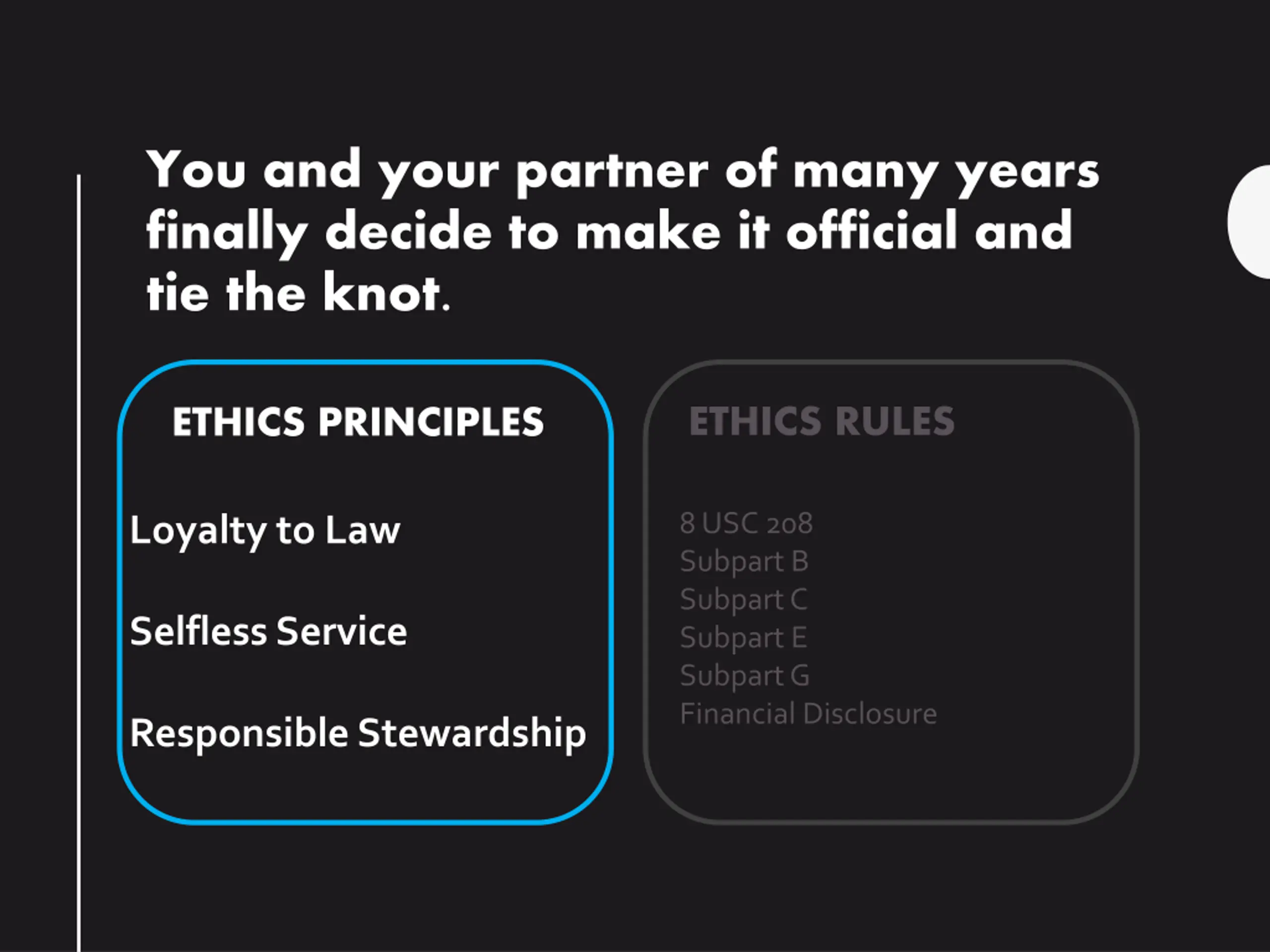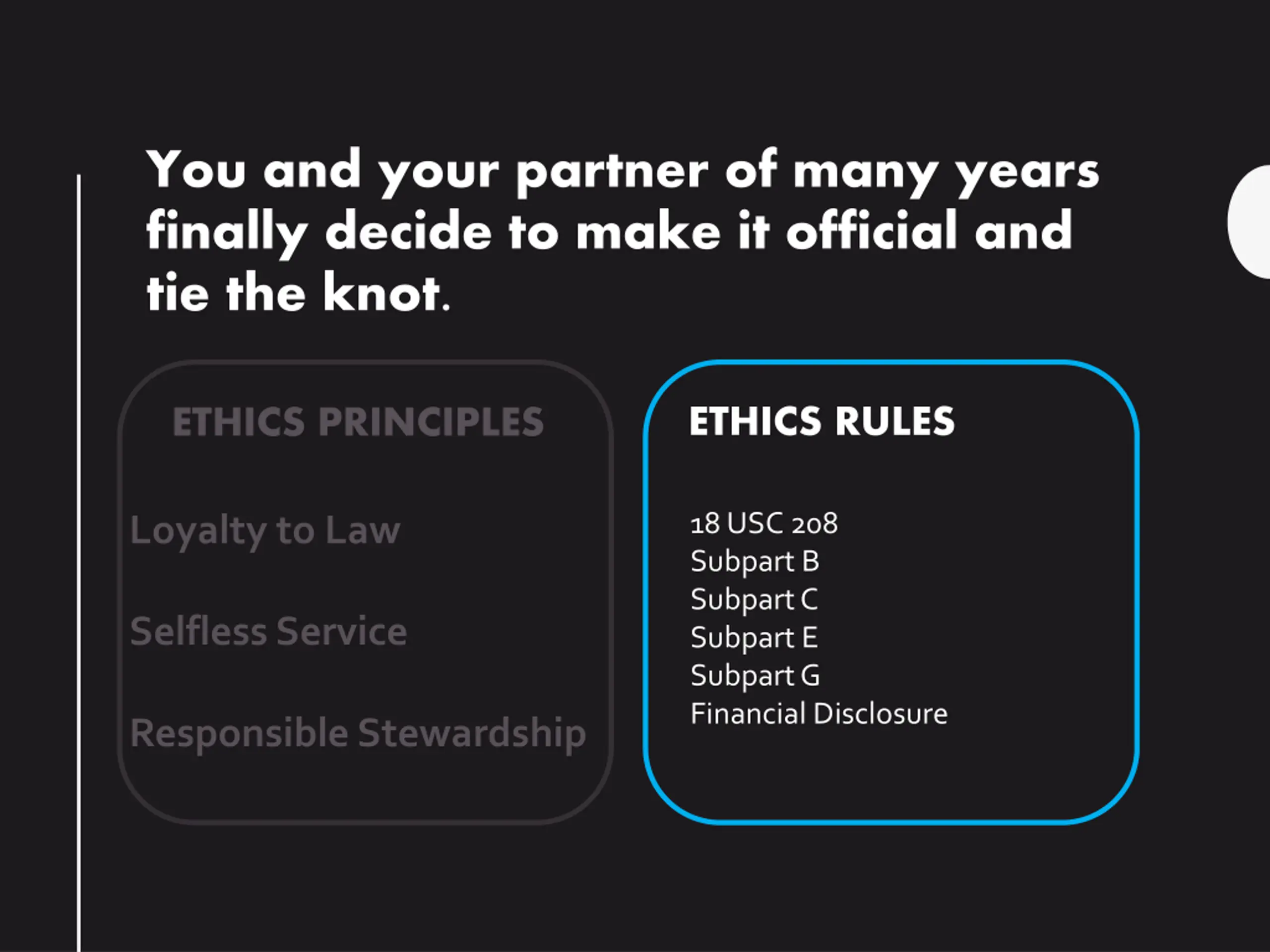 You and your partner of many years finally decide to make it official and tie the knot. ETHICS RULES ETHICS PRINCIPLES 18 USC 208 Subpart B Subpart C Subpart E Subpart G Financial Disclosure Loyalty to Law Selfless Service Responsible Stewardship
