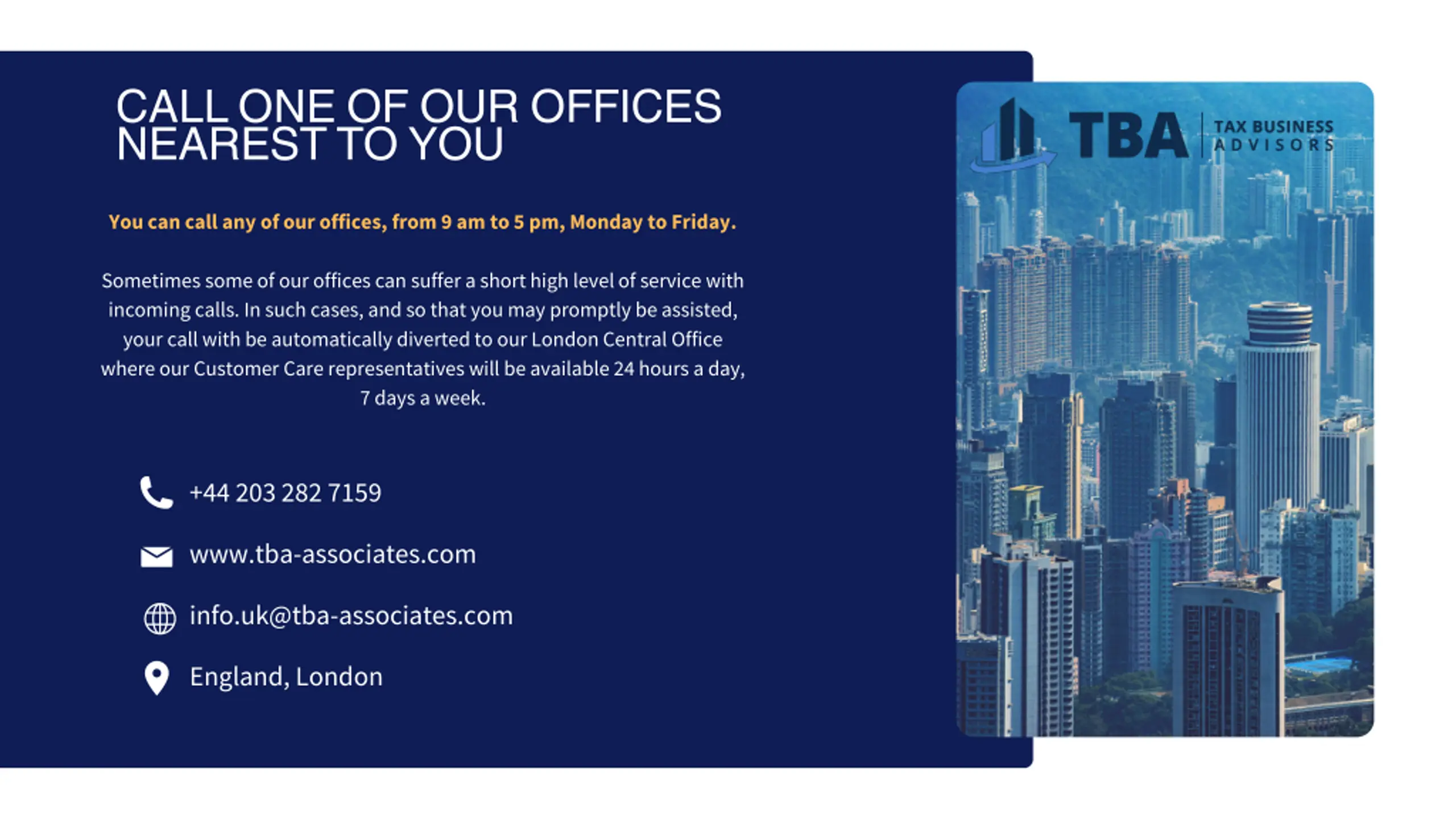 CALL ONE OF OUR OFFICES NEAREST TO YOU You can call any of our offices, from 9 am to 5 pm, Monday to Friday. Sometimes some of our offices can suffer a short high level of service with incoming calls. In such cases, and so that you may promptly be assisted, your call with be automatically diverted to our London Central Office where our Customer Care representatives will be available 24 hours a day, 7 days a week. +44 203 282 7159 www.tba-associates.com info.uk@tba-associates.com England, London