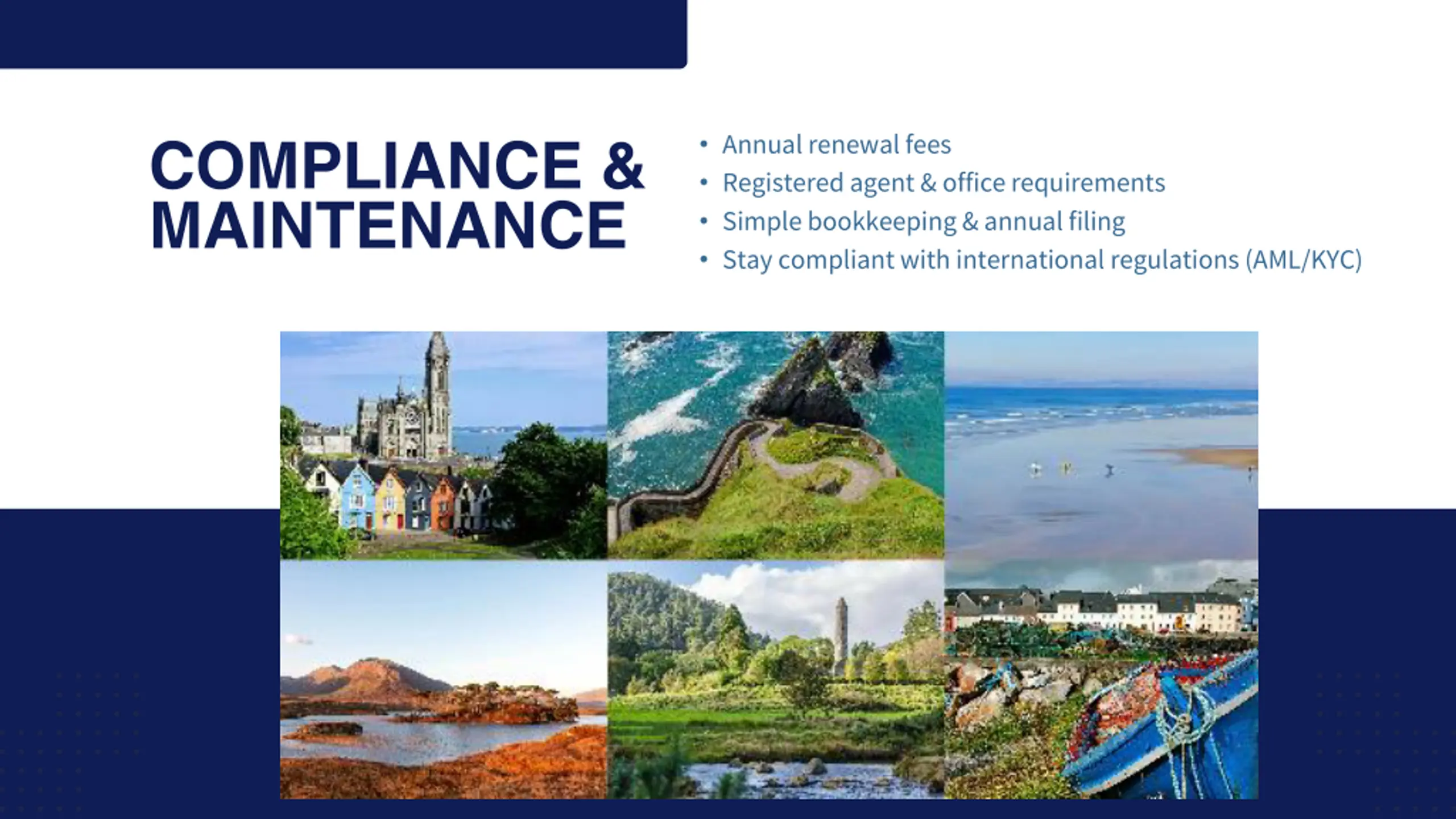 COMPLIANCE & MAINTENANCE Annual renewal fees Registered agent & office requirements Simple bookkeeping & annual filing Stay compliant with international regulations (AML/KYC)