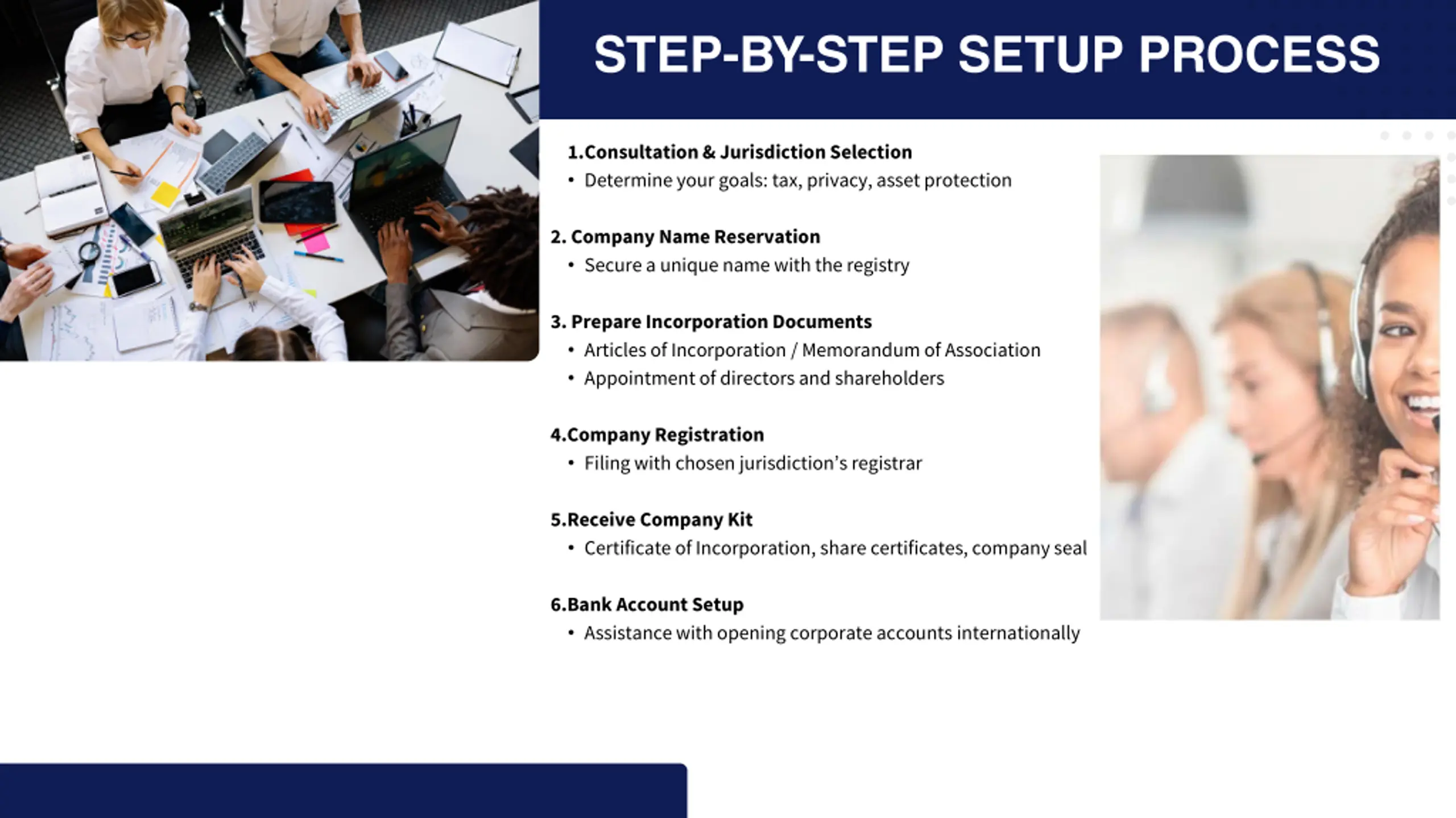 STEP-BY-STEP SETUP PROCESS 1.Consultation & Jurisdiction Selection Determine your goals: tax, privacy, asset protection 2. Company Name Reservation Secure a unique name with the registry 3. Prepare Incorporation Documents Articles of Incorporation / Memorandum of Association Appointment of directors and shareholders 4.Company Registration Filing with chosen jurisdiction s registrar 5.Receive Company Kit Certificate of Incorporation, share certificates, company seal 6.Bank Account Setup Assistance with opening corporate accounts internationally