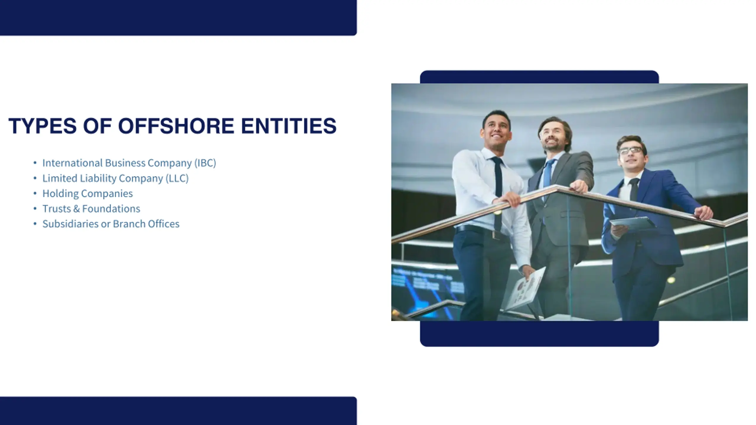TYPES OF OFFSHORE ENTITIES International Business Company (IBC) Limited Liability Company (LLC) Holding Companies Trusts & Foundations Subsidiaries or Branch Offices