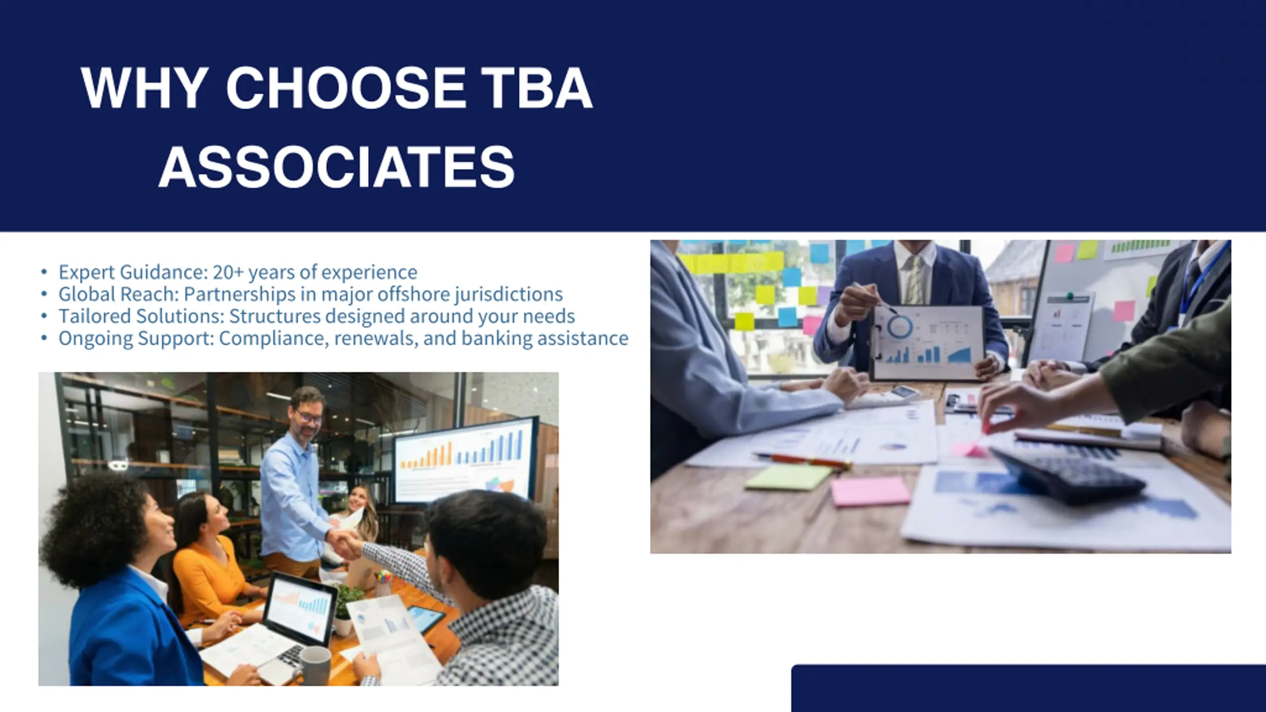 WHY CHOOSE TBA ASSOCIATES Expert Guidance: 20+ years of experience Global Reach: Partnerships in major offshore jurisdictions Tailored Solutions: Structures designed around your needs Ongoing Support: Compliance, renewals, and banking assistance
