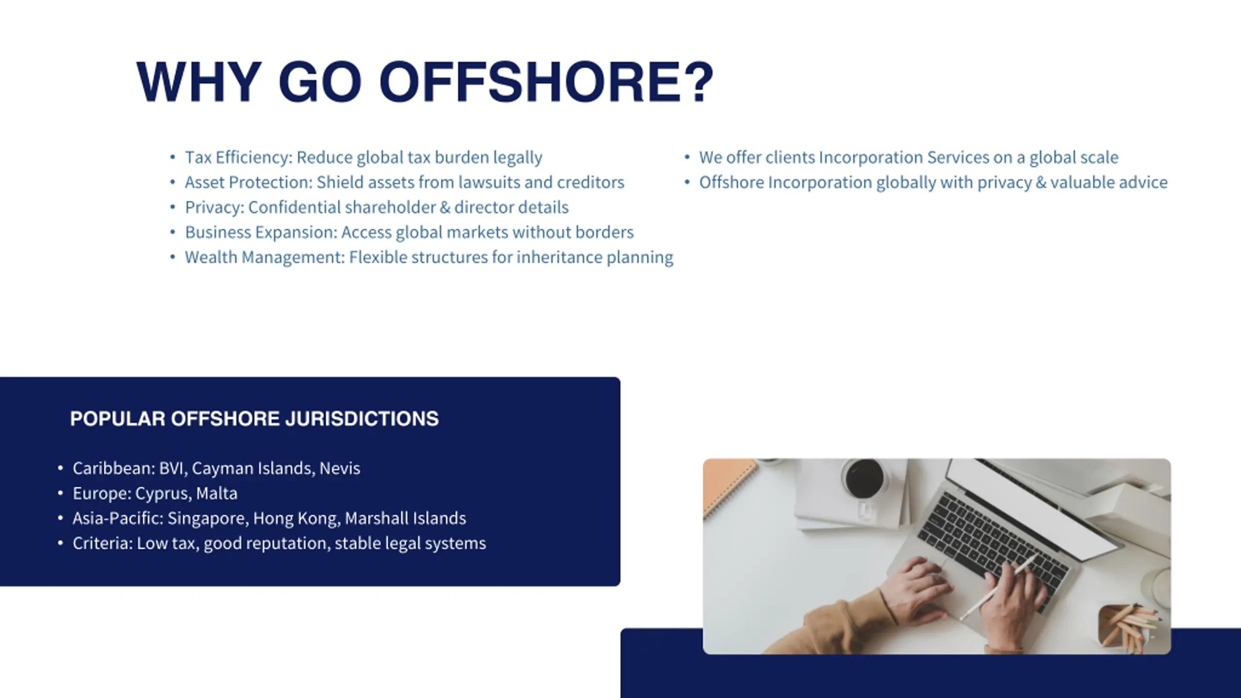 WHY GO OFFSHORE? Tax Efficiency: Reduce global tax burden legally Asset Protection: Shield assets from lawsuits and creditors Privacy: Confidential shareholder & director details Business Expansion: Access global markets without borders Wealth Management: Flexible structures for inheritance planning We offer clients Incorporation Services on a global scale Offshore Incorporation globally with privacy & valuable advice POPULAR OFFSHORE JURISDICTIONS Caribbean: BVI, Cayman Islands, Nevis Europe: Cyprus, Malta Asia-Pacific: Singapore, Hong Kong, Marshall Islands Criteria: Low tax, good reputation, stable legal systems