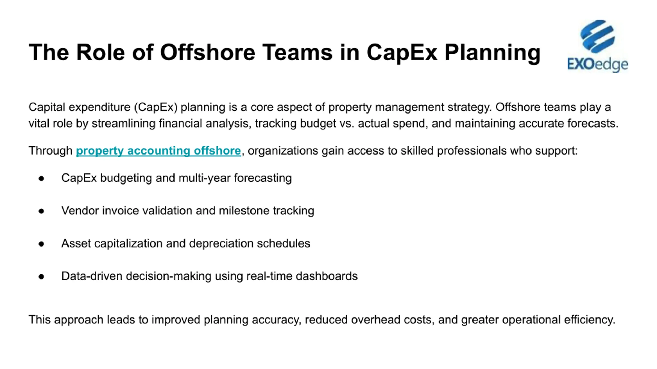 Benefits of Property Accounting Offshore in CapEx Implementing property accounting offshore provides clear advantages for CapEx planning: 24/7 Productivity: Time zone advantages enable overnight turnaround of reporting tasks Cost Efficiency: Offshore support lowers administrative burdens Expertise at Scale: Access to domain specialists in CapEx accounting Real-Time Insights: Offshore teams manage dashboards for fund tracking and ROI analysis With EXO Edge s offshore teams, property firms stay ahead in managing large-scale upgrades, renovations, and expansions.