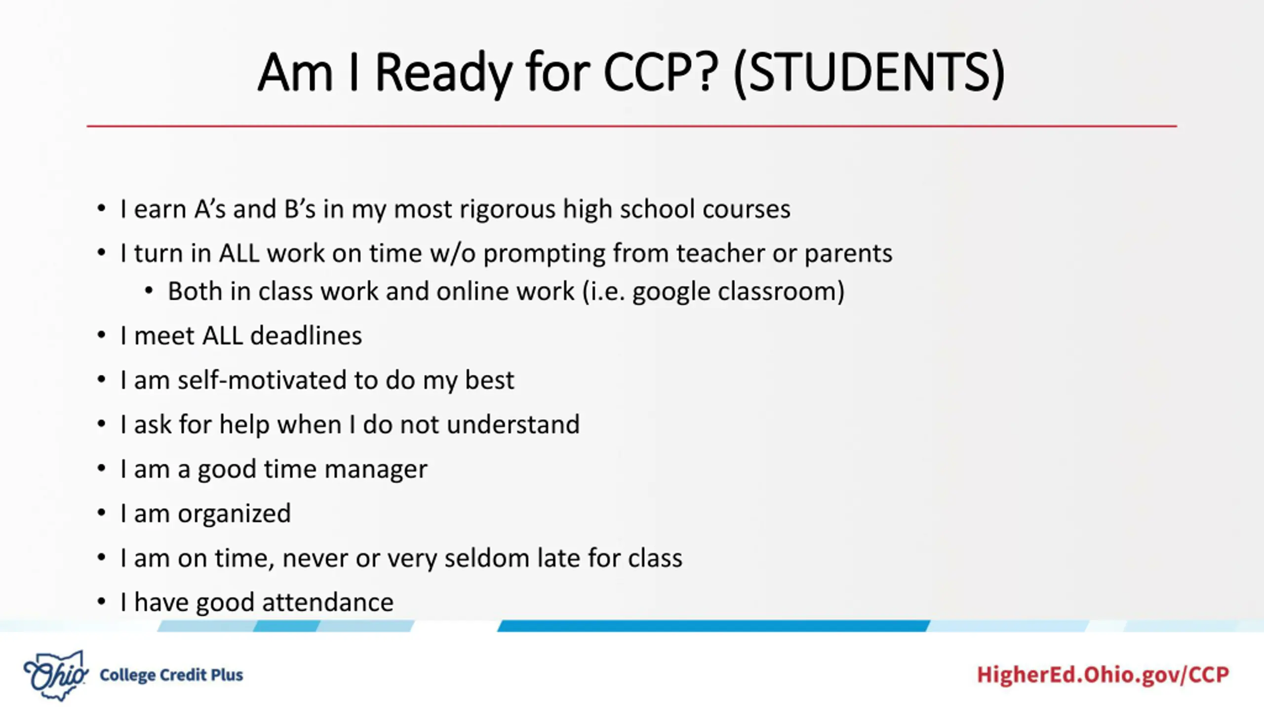 Am I Ready for CCP? (STUDENTS) Am I Ready for CCP? (STUDENTS) I earn A s and B s in my most rigorous high school courses I turn in ALL work on time w/o prompting from teacher or parents Both in class work and online work (i.e. google classroom) I meet ALL deadlines I am self-motivated to do my best I ask for help when I do not understand I am a good time manager I am organized I am on time, never or very seldom late for class I have good attendance