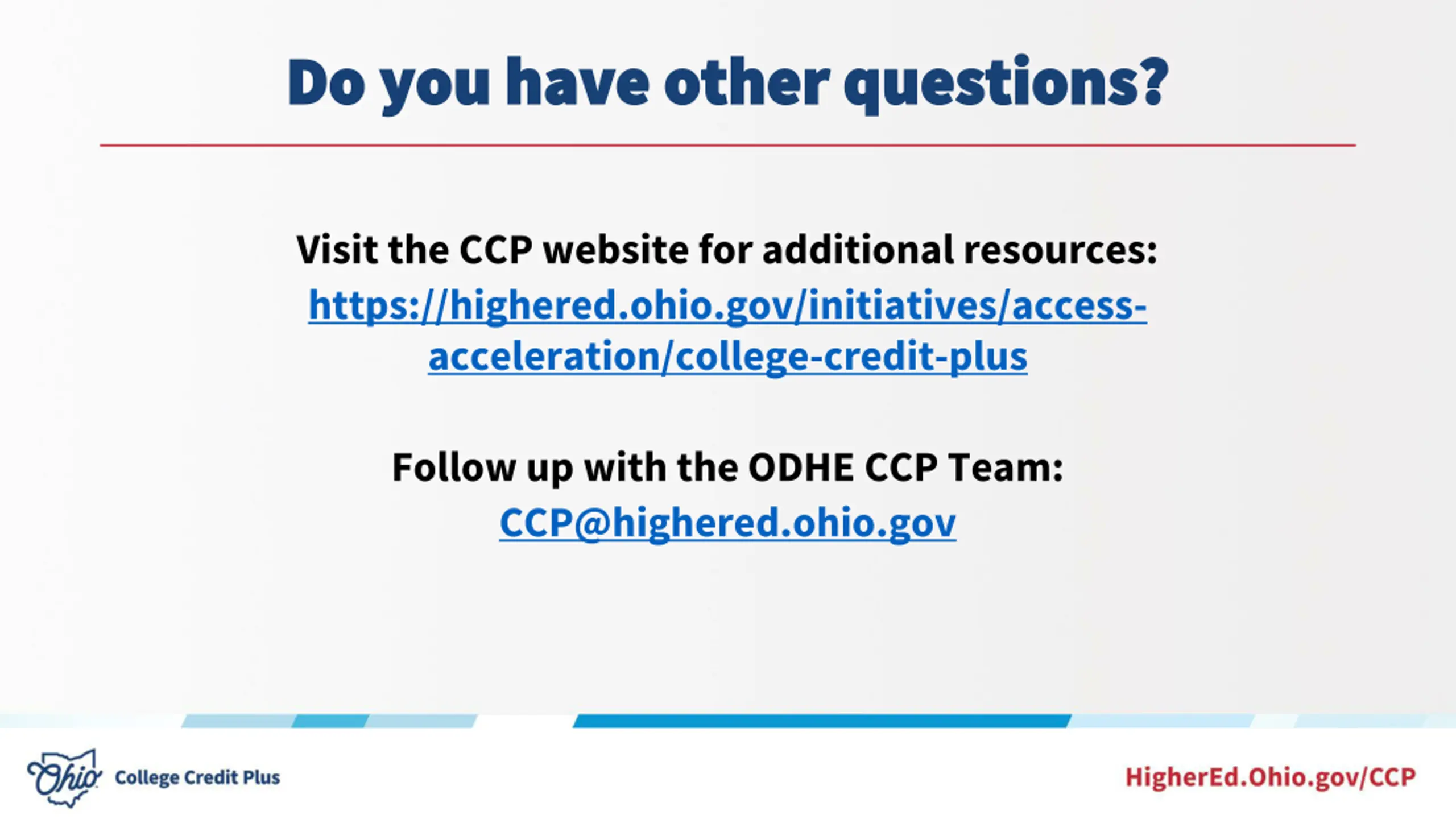 Do you have other questions? Do you have other questions? Visit the CCP website for additional resources: https://highered.ohio.gov/initiatives/access- acceleration/college-credit-plus Follow up with the ODHE CCP Team: CCP@highered.ohio.gov