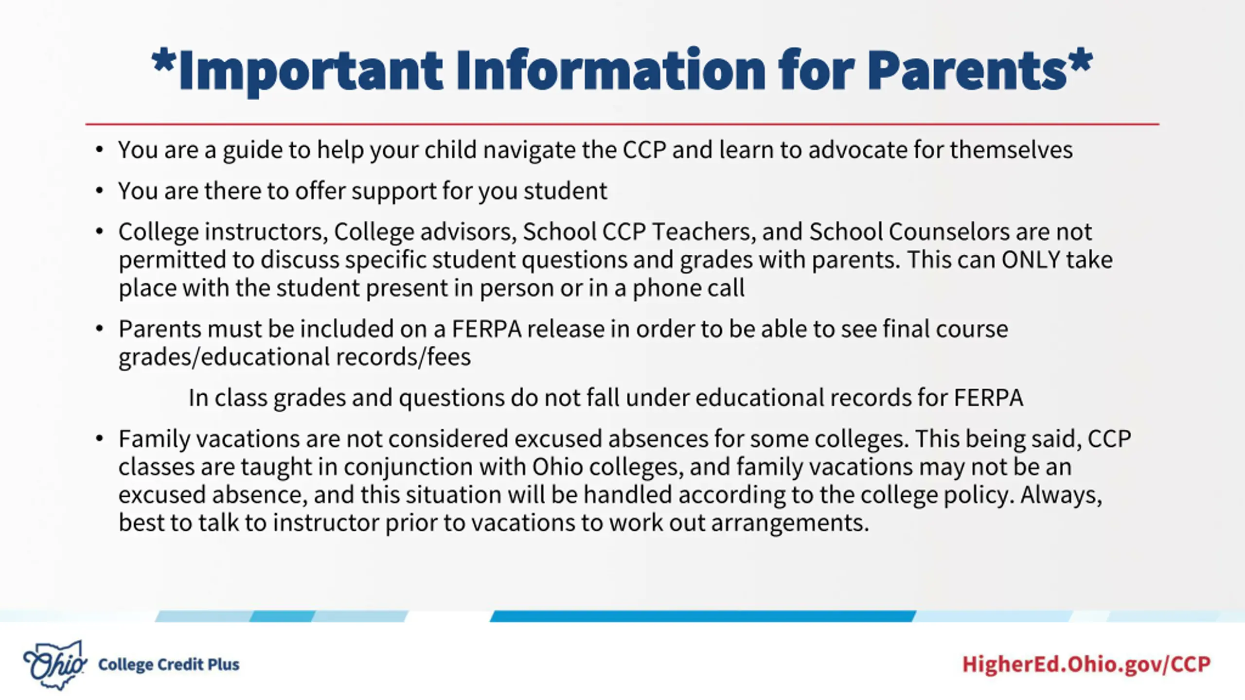 *Important Information for Parents* *Important Information for Parents* You are a guide to help your child navigate the CCP and learn to advocate for themselves You are there to offer support for you student College instructors, College advisors, School CCP Teachers, and School Counselors are not permitted to discuss specific student questions and grades with parents. This can ONLY take place with the student present in person or in a phone call Parents must be included on a FERPA release in order to be able to see final course grades/educational records/fees In class grades and questions do not fall under educational records for FERPA Family vacations are not considered excused absences for some colleges. This being said, CCP classes are taught in conjunction with Ohio colleges, and family vacations may not be an excused absence, and this situation will be handled according to the college policy. Always, best to talk to instructor prior to vacations to work out arrangements.