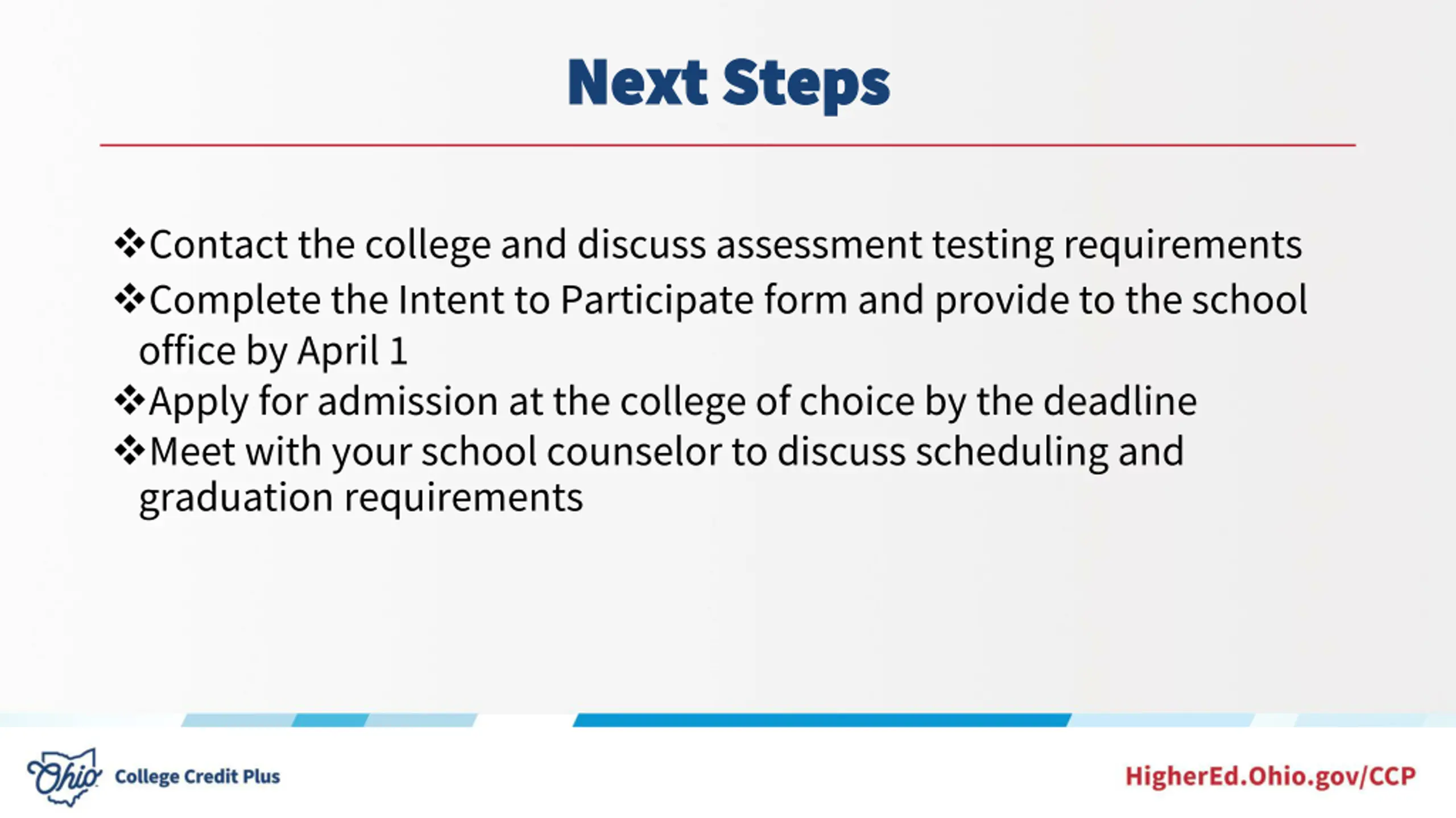 Next Steps Next Steps Contact the college and discuss assessment testing requirements Complete the Intent to Participate form and provide to the school office by April 1 Apply for admission at the college of choice by the deadline Meet with your school counselor to discuss scheduling and graduation requirements