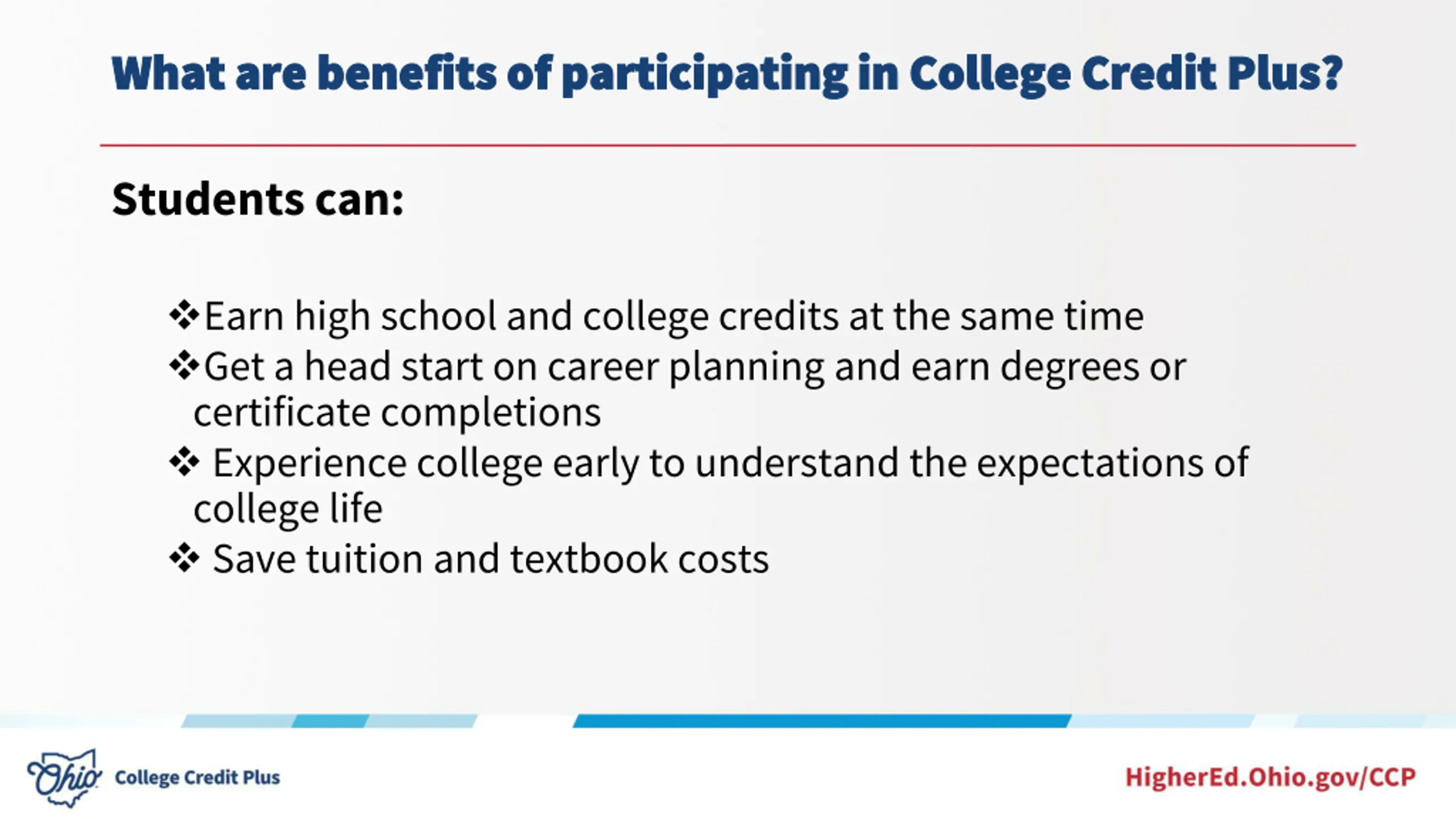 What are benefits of participating in College Credit Plus? What are benefits of participating in College Credit Plus? Students can: Earn high school and college credits at the same time Get a head start on career planning and earn degrees or certificate completions Experience college early to understand the expectations of college life Save tuition and textbook costs