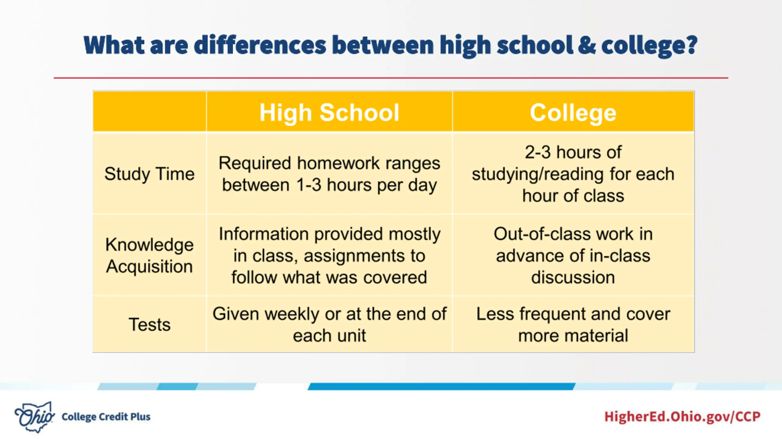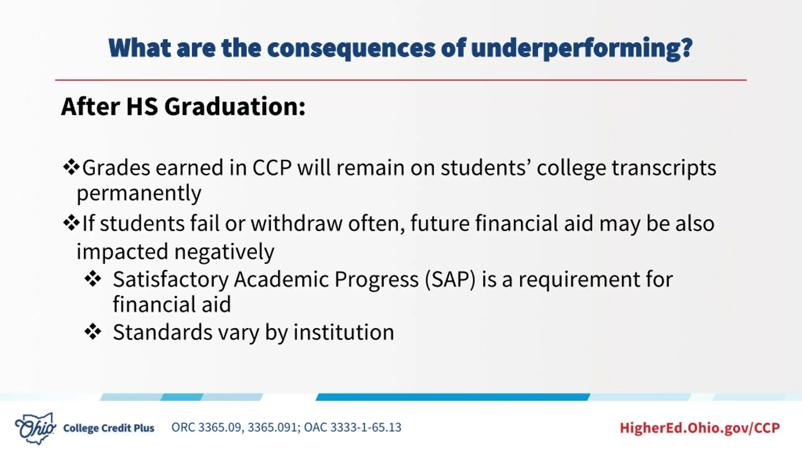 What are the consequences of underperforming? What are the consequences of underperforming? After HS Graduation: Grades earned in CCP will remain on students college transcripts permanently If students fail or withdraw often, future financial aid may be also impacted negatively Satisfactory Academic Progress (SAP) is a requirement for financial aid Standards vary by institution ORC 3365.09, 3365.091; OAC 3333-1-65.13