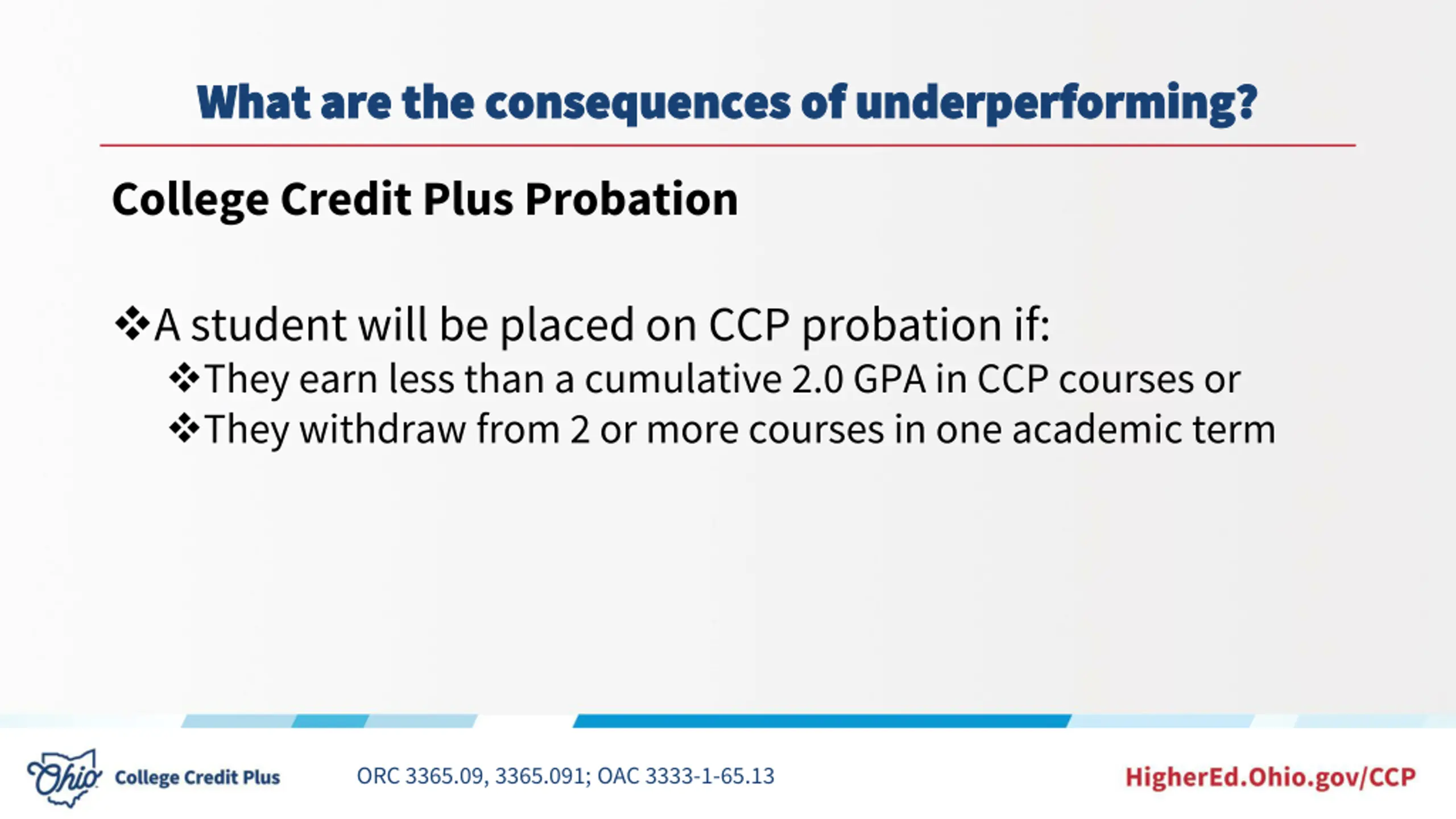 What are the consequences of underperforming? What are the consequences of underperforming? College Credit Plus Probation A student will be placed on CCP probation if: They earn less than a cumulative 2.0 GPA in CCP courses or They withdraw from 2 or more courses in one academic term ORC 3365.09, 3365.091; OAC 3333-1-65.13
