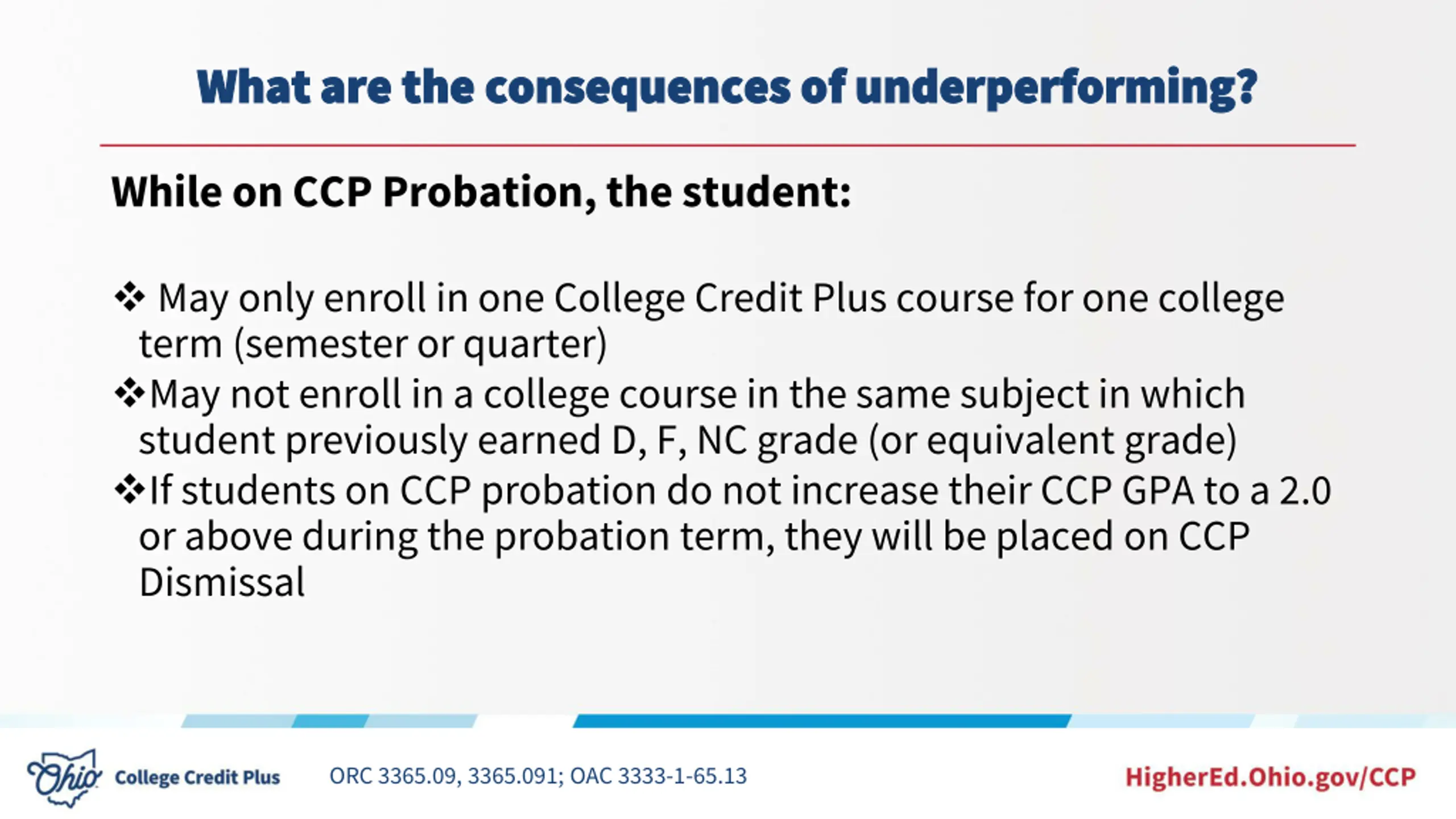 What are the consequences of underperforming? What are the consequences of underperforming? While on CCP Probation, the student: May only enroll in one College Credit Plus course for one college term (semester or quarter) May not enroll in a college course in the same subject in which student previously earned D, F, NC grade (or equivalent grade) If students on CCP probation do not increase their CCP GPA to a 2.0 or above during the probation term, they will be placed on CCP Dismissal ORC 3365.09, 3365.091; OAC 3333-1-65.13