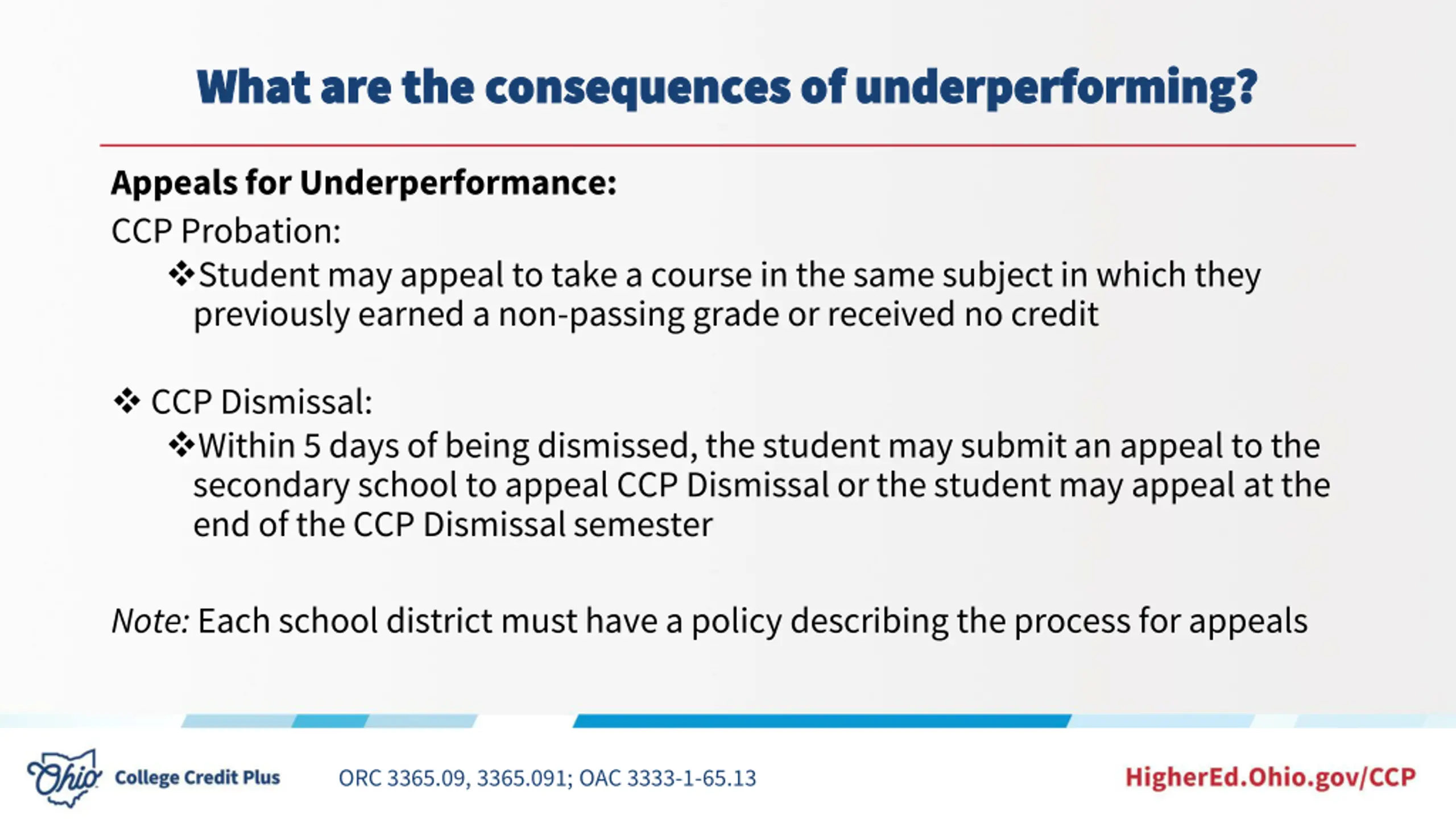 What are the consequences of underperforming? What are the consequences of underperforming? Appeals for Underperformance: CCP Probation: Student may appeal to take a course in the same subject in which they previously earned a non-passing grade or received no credit CCP Dismissal: Within 5 days of being dismissed, the student may submit an appeal to the secondary school to appeal CCP Dismissal or the student may appeal at the end of the CCP Dismissal semester Note: Each school district must have a policy describing the process for appeals ORC 3365.09, 3365.091; OAC 3333-1-65.13