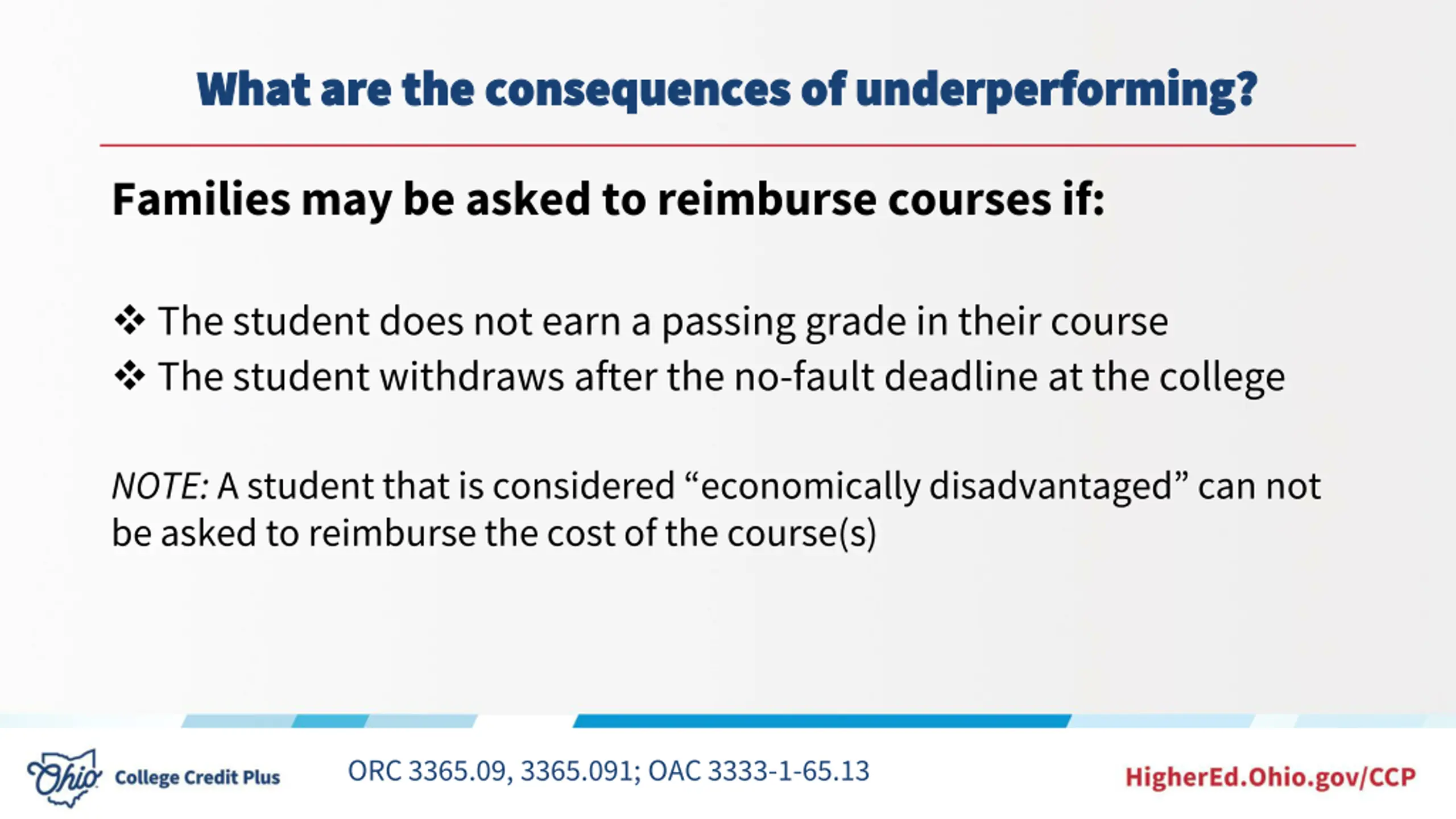 What are the consequences of underperforming? What are the consequences of underperforming? Families may be asked to reimburse courses if: The student does not earn a passing grade in their course The student withdraws after the no-fault deadline at the college NOTE: A student that is considered economically disadvantaged can not be asked to reimburse the cost of the course(s) ORC 3365.09, 3365.091; OAC 3333-1-65.13