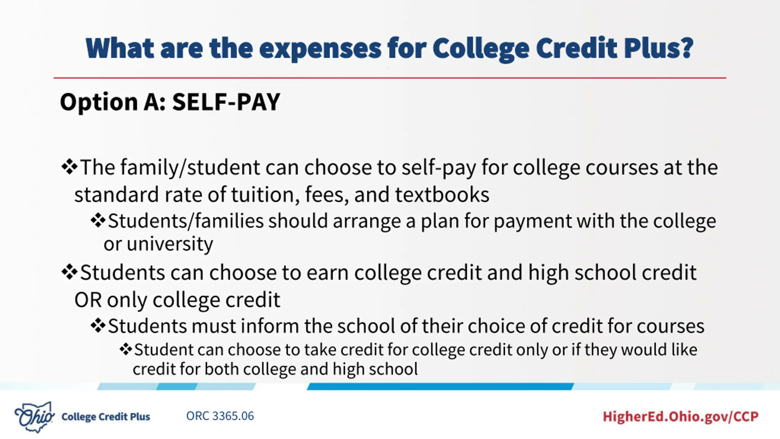 What are the expenses for College Credit Plus? What are the expenses for College Credit Plus? Option A: SELF-PAY The family/student can choose to self-pay for college courses at the standard rate of tuition, fees, and textbooks Students/families should arrange a plan for payment with the college or university Students can choose to earn college credit and high school credit OR only college credit Students must inform the school of their choice of credit for courses Student can choose to take credit for college credit only or if they would like credit for both college and high school ORC 3365.06