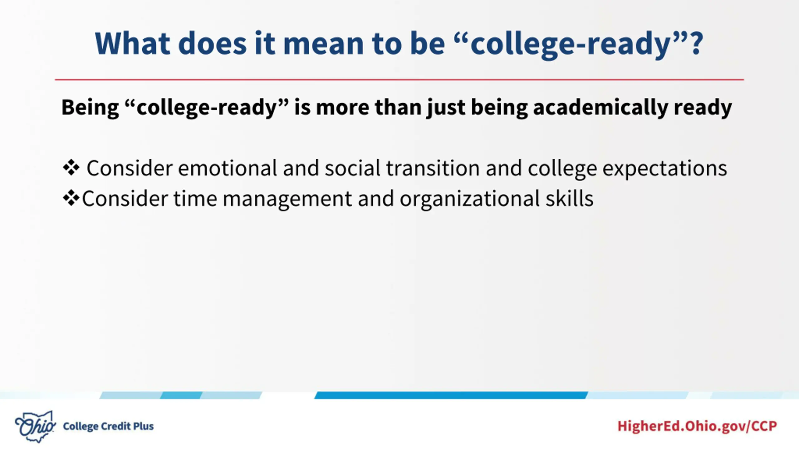 What does it mean to be college-ready? Being college-ready is more than just being academically ready Consider emotional and social transition and college expectations Consider time management and organizational skills