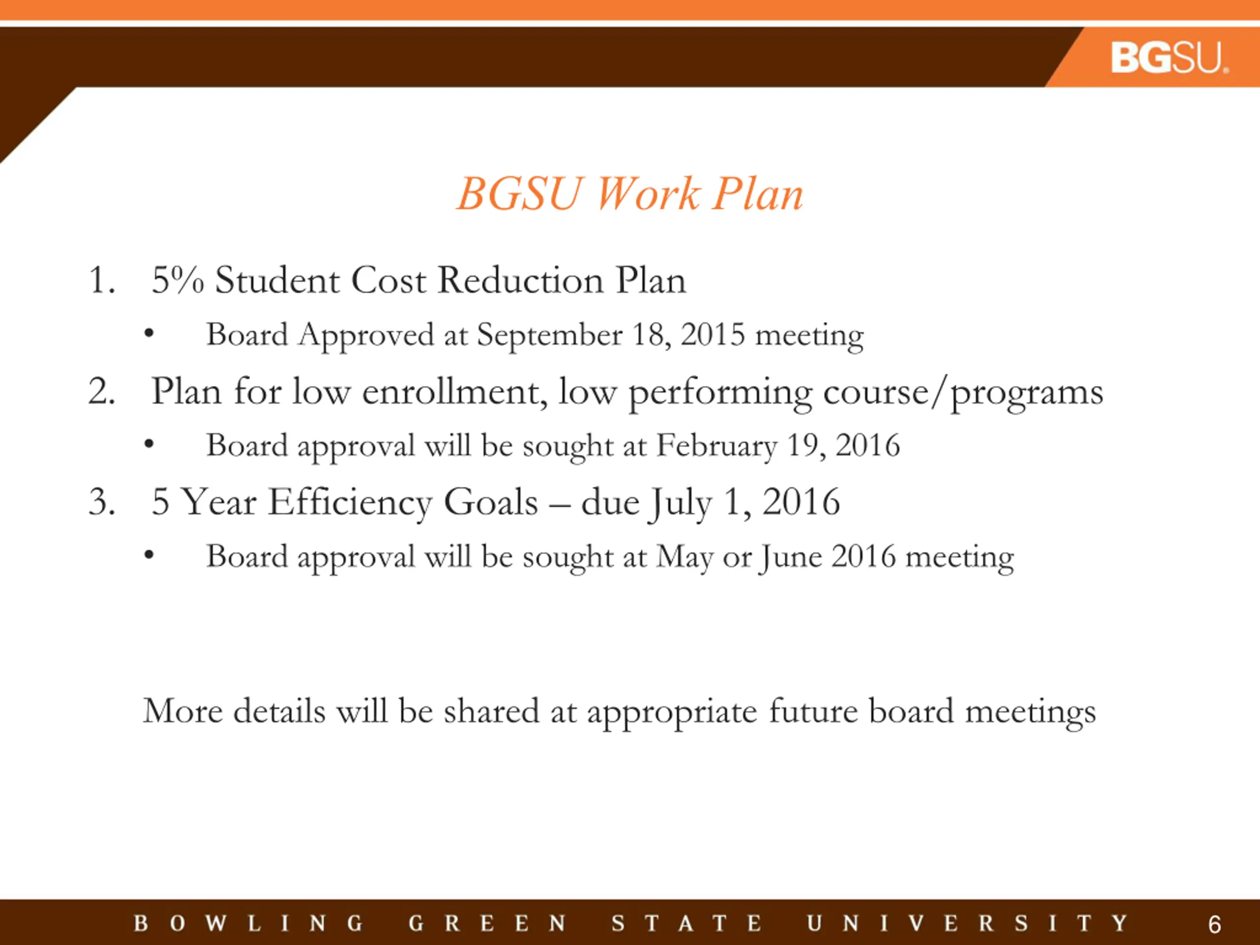 BGSU Work Plan 1. 5% Student Cost Reduction Plan Board Approved at September 18, 2015 meeting 2. Plan for low enrollment, low performing course/programs Board approval will be sought at February 19, 2016 3. 5 Year Efficiency Goals due July 1, 2016 Board approval will be sought at May or June 2016 meeting More details will be shared at appropriate future board meetings 6