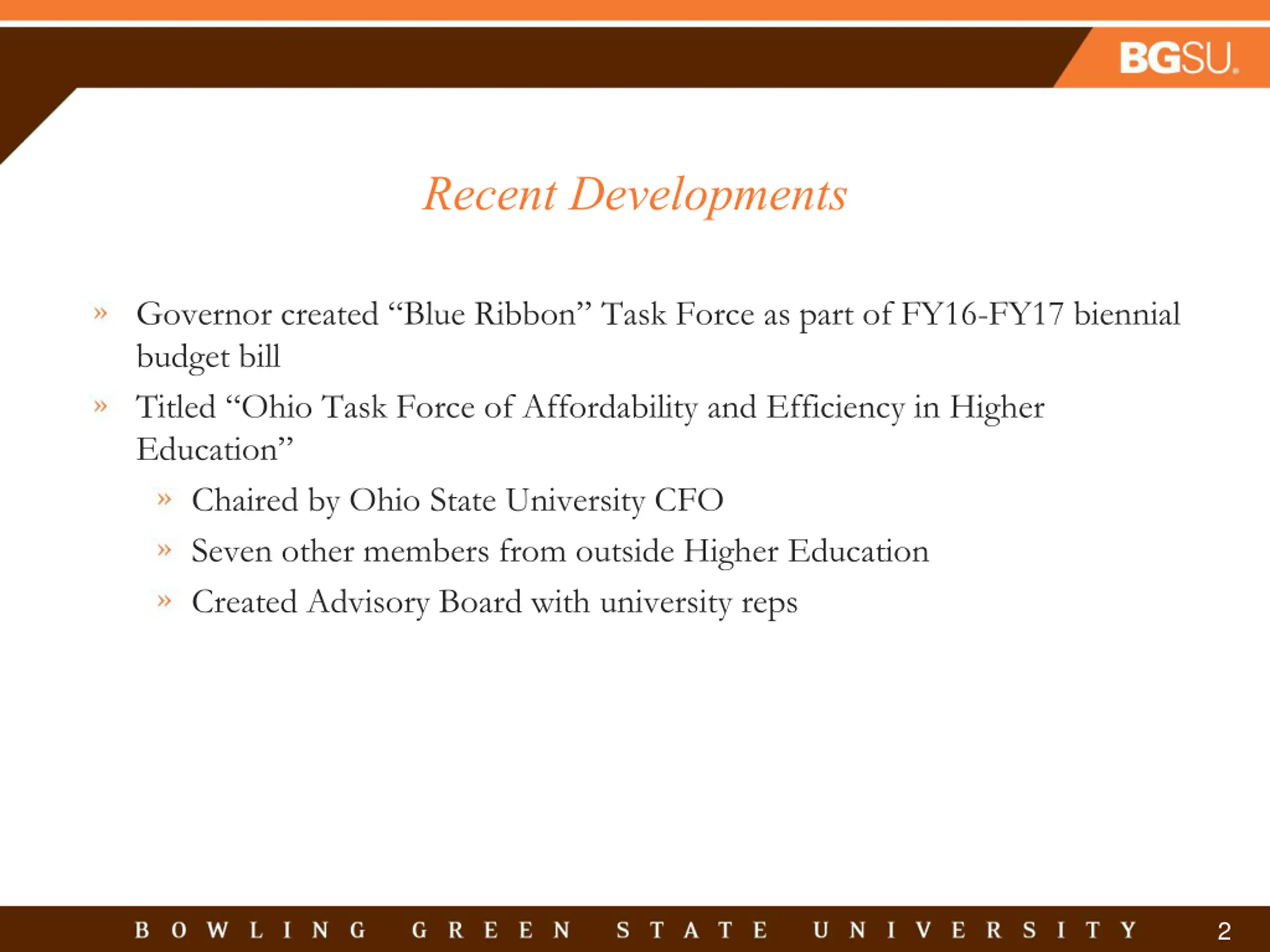 Recent Developments Governor created Blue Ribbon Task Force as part of FY16-FY17 biennial budget bill Titled Ohio Task Force of Affordability and Efficiency in Higher Education Chaired by Ohio State University CFO Seven other members from outside Higher Education Created Advisory Board with university reps 2