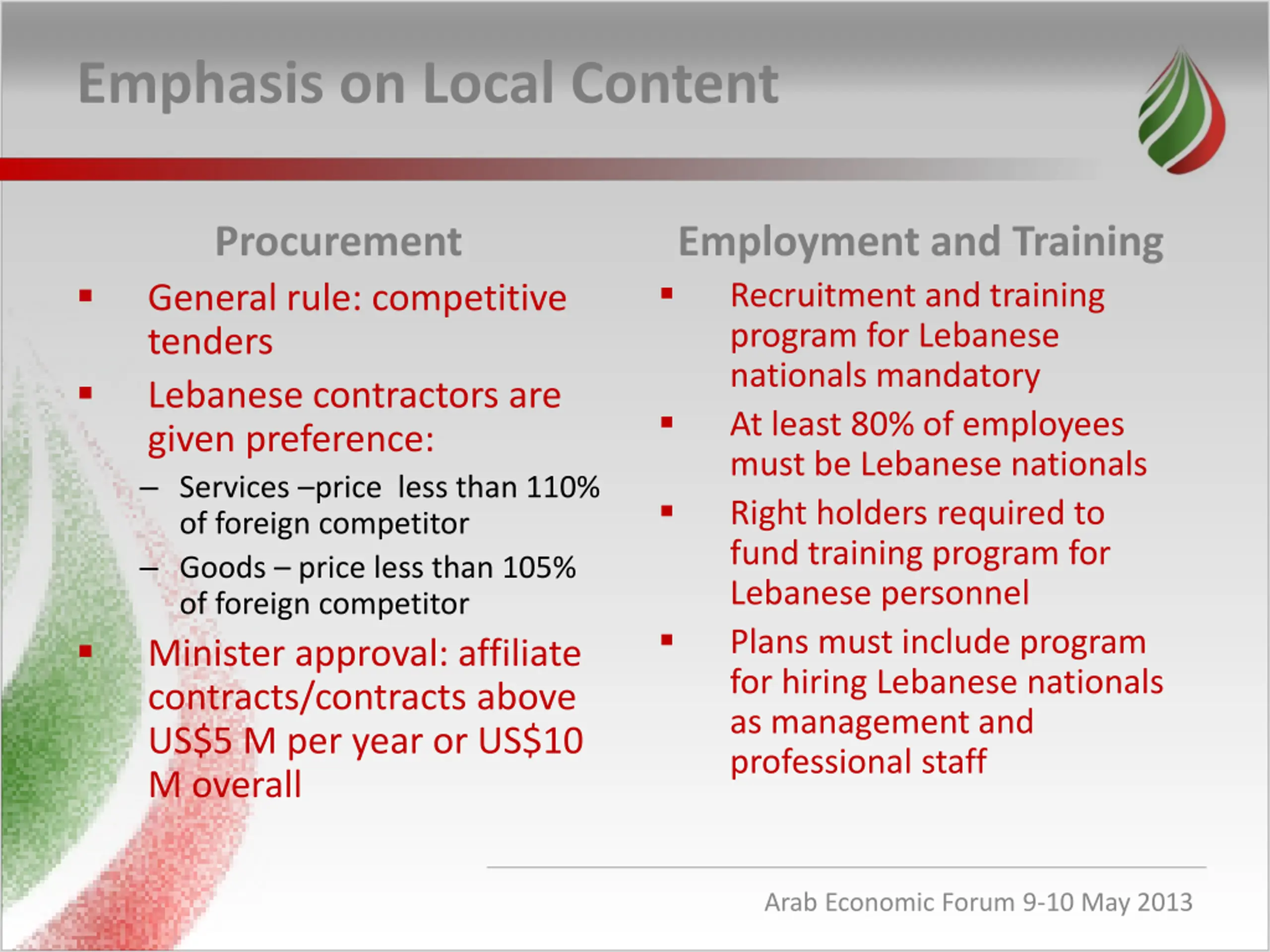 Emphasis on Local Content Procurement General rule: competitive tenders Lebanese contractors are given preference: Services price less than 110% of foreign competitor Goods price less than 105% of foreign competitor Minister approval: affiliate contracts/contracts above US$5 M per year or US$10 M overall Employment and Training Recruitment and training program for Lebanese nationals mandatory At least 80% of employees must be Lebanese nationals Right holders required to fund training program for Lebanese personnel Plans must include program for hiring Lebanese nationals as management and professional staff Arab Economic Forum 9-10 May 2013