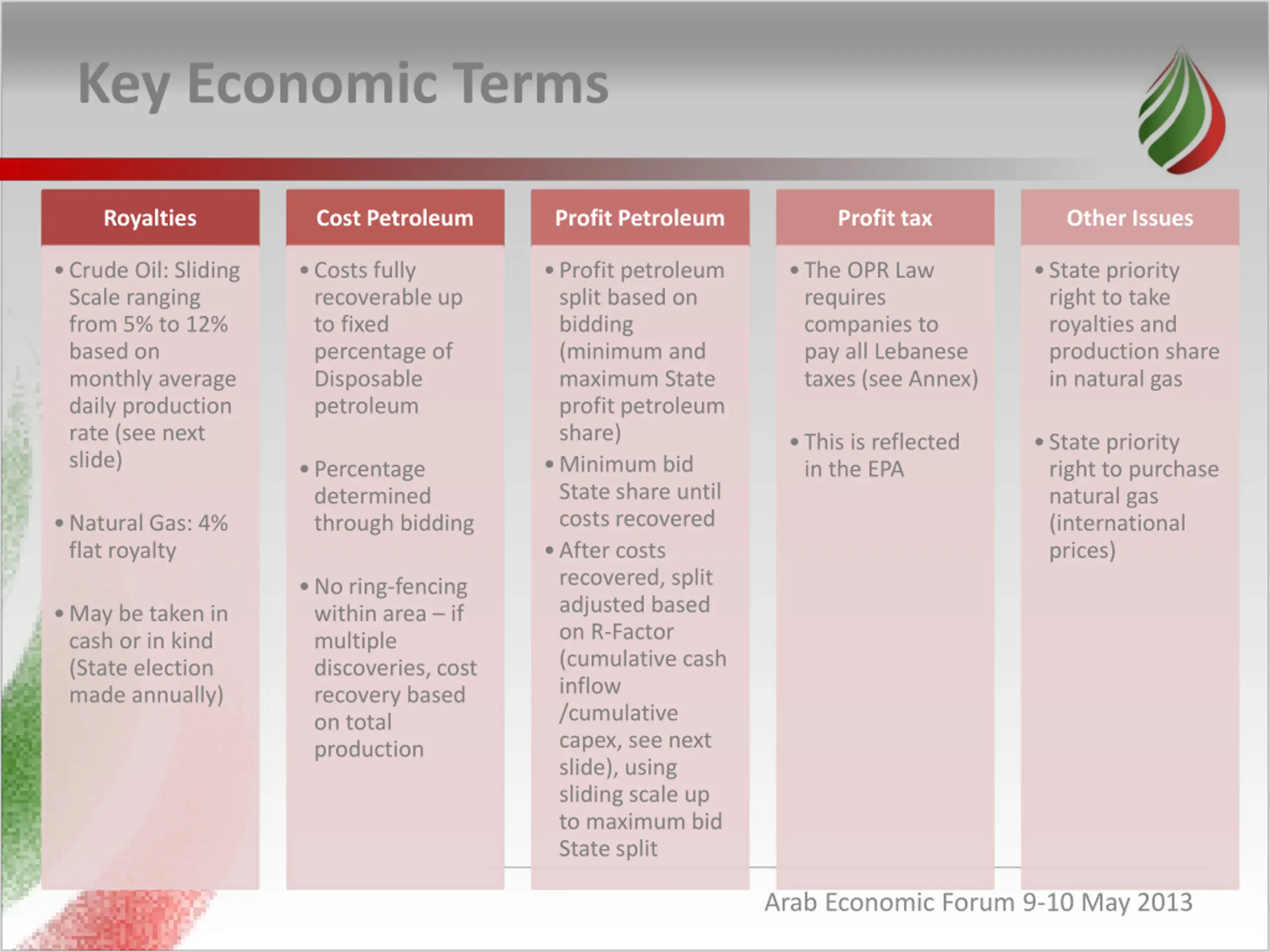 Exploration & Production Agreement Offshore Petroleum Resources Law (OPR Law) Petroleum Activities Regulation (PAR) EPA is a commercial contract and a roadmap of OPR Law and PAR Legal Basis Exploration and Production Agreement with Production Sharing Industry Standard Structure Robust economic incentives to explore, develop and produce Structure Exploration: Five years, divided into periods of 3 years and two years, with possible extension Appraisal: up to two years, plus marketing period for natural gas discovery (if approved) Production: 25 years plus possible 5 year extension with secondary investment Phases Royalties: sliding scale for crude oil, flat 4% for natural gas Cost petroleum up to percentage of petroleum produced, based on bid Profit petroleum split based on bid -Adjustment based on R-Factor Economics Protects Key Lebanese Interests Lebanese employment: At least 80% Lebanese nationals Procurement: Lebanese contracting requirement where competitive Environment and Decommissioning: International standard requirements and funding Arab Economic Forum 9-10 May 2013