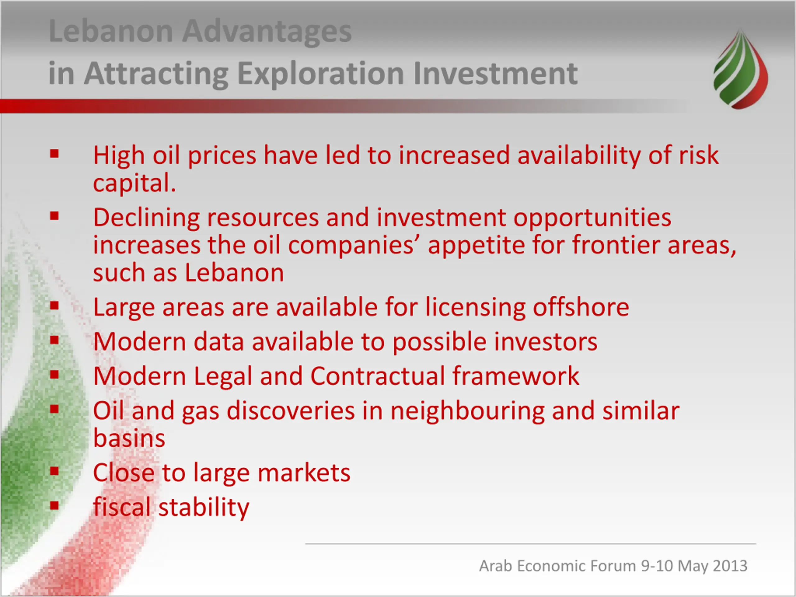 Lebanon Advantages in Attracting Exploration Investment High oil prices have led to increased availability of risk capital. Declining resources and investment opportunities increases the oil companies appetite for frontier areas, such as Lebanon Large areas are available for licensing offshore Modern data available to possible investors Modern Legal and Contractual framework Oil and gas discoveries in neighbouring and similar basins Close to large markets fiscal stability Arab Economic Forum 9-10 May 2013