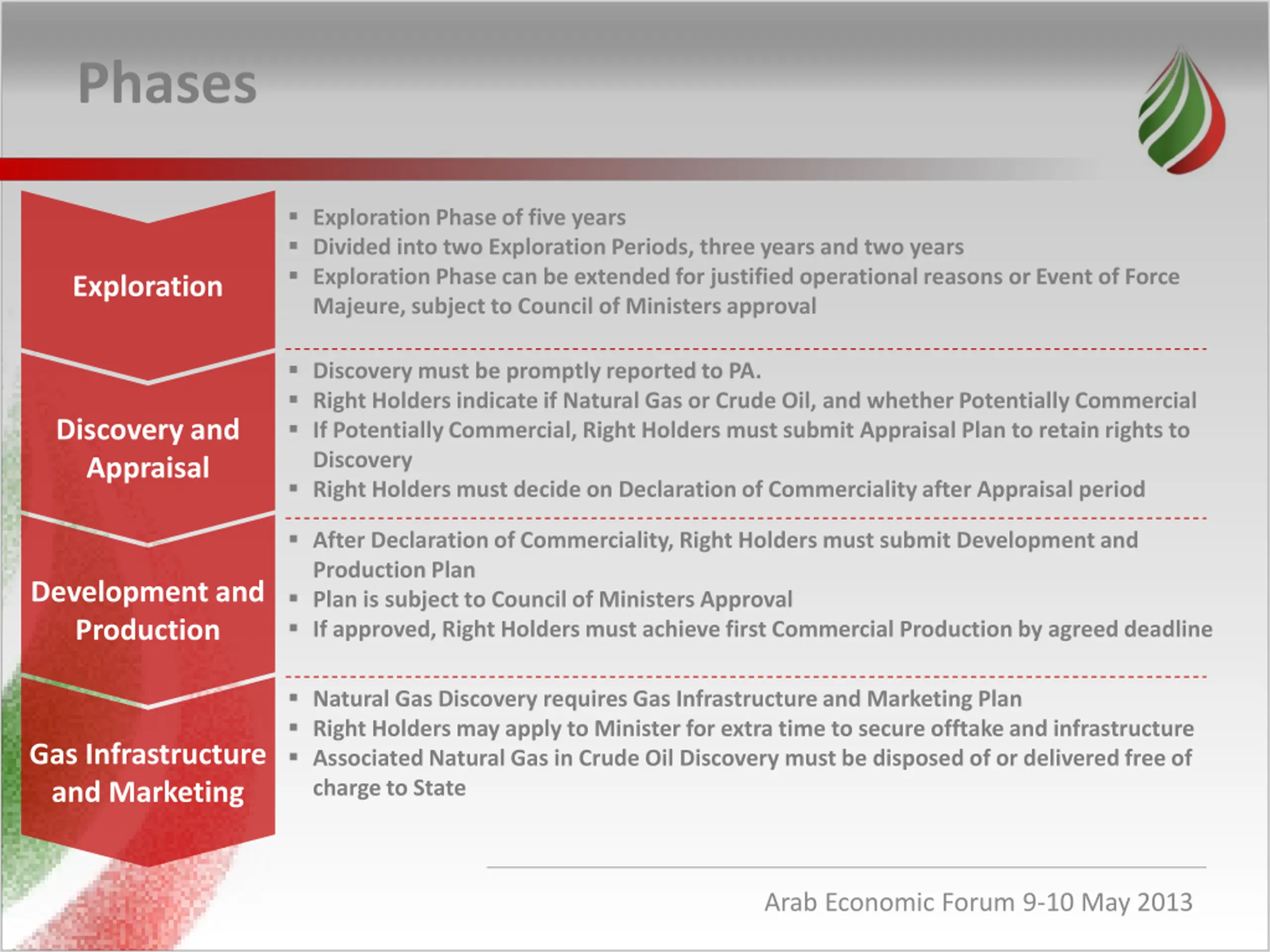 Phases Exploration Phase of five years Divided into two Exploration Periods, three years and two years Exploration Phase can be extended for justified operational reasons or Event of Force Majeure, subject to Council of Ministers approval Exploration Discovery must be promptly reported to PA. Right Holders indicate if Natural Gas or Crude Oil, and whether Potentially Commercial If Potentially Commercial, Right Holders must submit Appraisal Plan to retain rights to Discovery Right Holders must decide on Declaration of Commerciality after Appraisal period Discovery and Appraisal After Declaration of Commerciality, Right Holders must submit Development and Production Plan Plan is subject to Council of Ministers Approval If approved, Right Holders must achieve first Commercial Production by agreed deadline Development and Production Natural Gas Discovery requires Gas Infrastructure and Marketing Plan Right Holders may apply to Minister for extra time to secure offtake and infrastructure Associated Natural Gas in Crude Oil Discovery must be disposed of or delivered free of charge to State Gas Infrastructure and Marketing Arab Economic Forum 9-10 May 2013