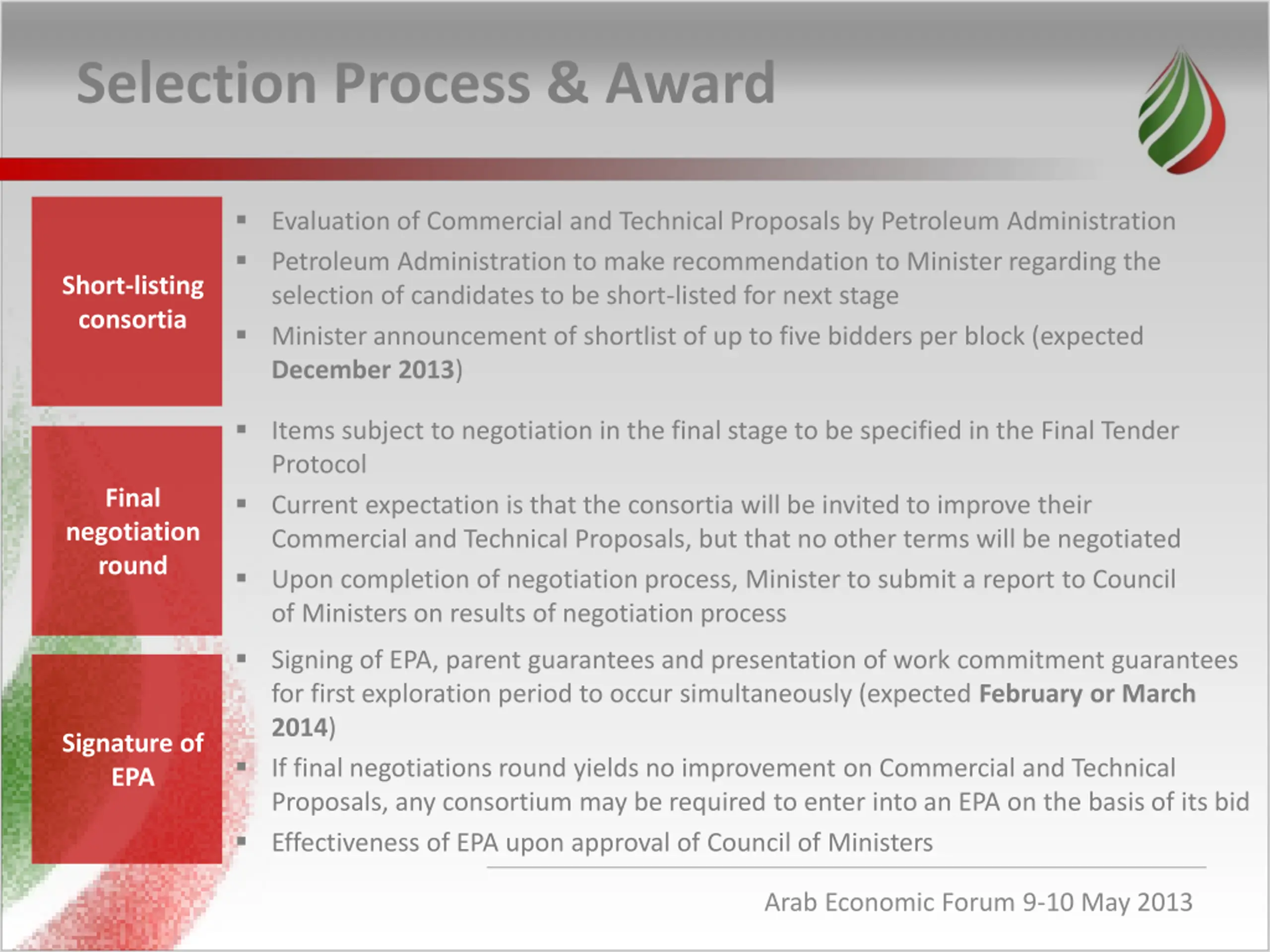 Selection Process & Award Evaluation of Commercial and Technical Proposals by Petroleum Administration Petroleum Administration to make recommendation to Minister regarding the selection of candidates to be short-listed for next stage Minister announcement of shortlist of up to five bidders per block (expected December 2013) Short-listing consortia Items subject to negotiation in the final stage to be specified in the Final Tender Protocol Current expectation is that the consortia will be invited to improve their Commercial and Technical Proposals, but that no other terms will be negotiated Upon completion of negotiation process, Minister to submit a report to Council of Ministers on results of negotiation process Final negotiation round Signing of EPA, parent guarantees and presentation of work commitment guarantees for first exploration period to occur simultaneously (expected February or March 2014) If final negotiations round yields no improvement on Commercial and Technical Proposals, any consortium may be required to enter into an EPA on the basis of its bid Effectiveness of EPA upon approval of Council of Ministers Signature of EPA Arab Economic Forum 9-10 May 2013