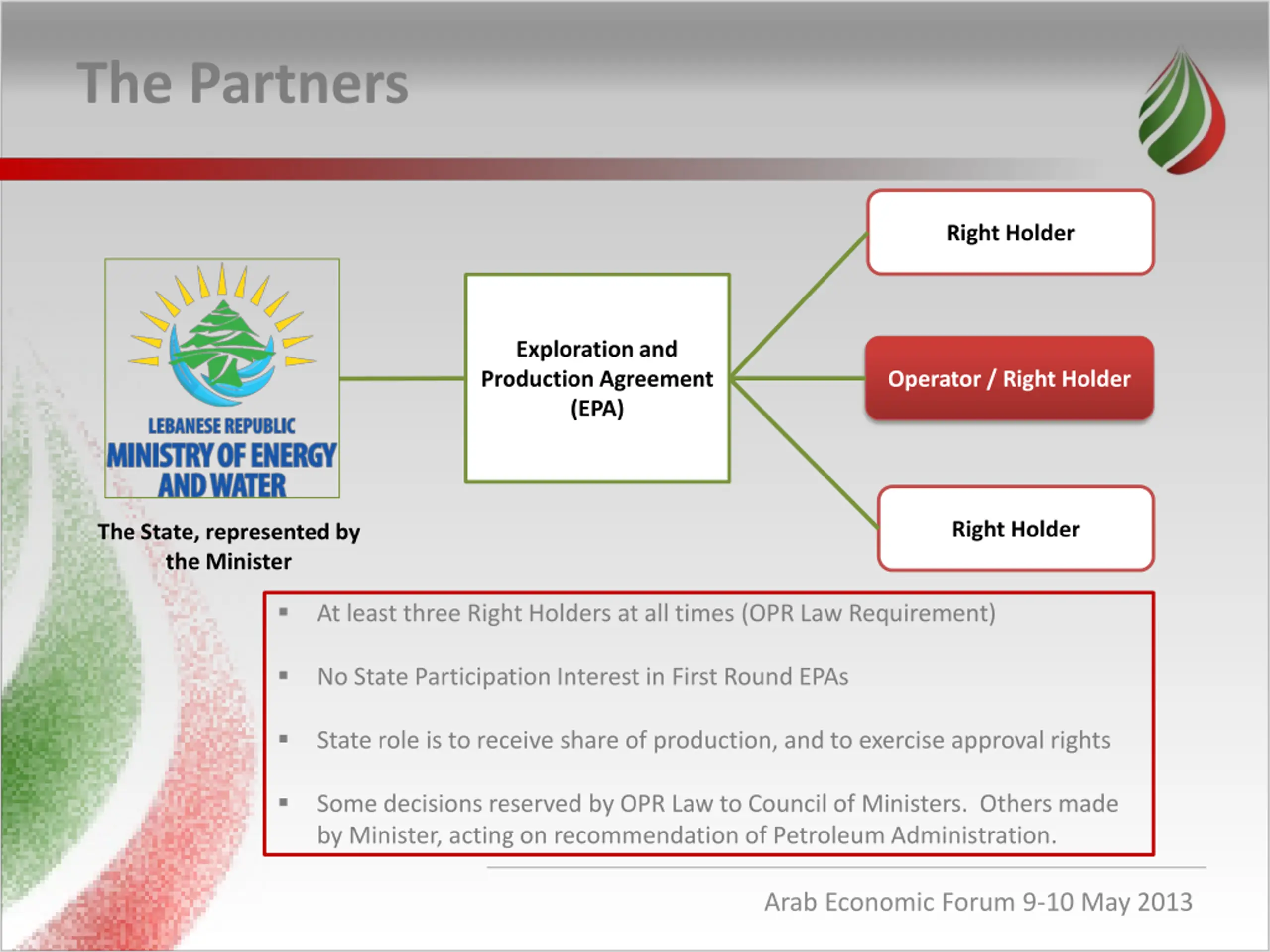 The Partners Right Holder Exploration and Production Agreement (EPA) Operator / Right Holder Right Holder The State, represented by the Minister At least three Right Holders at all times (OPR Law Requirement) No State Participation Interest in First Round EPAs State role is to receive share of production, and to exercise approval rights Some decisions reserved by OPR Law to Council of Ministers. Others made by Minister, acting on recommendation of Petroleum Administration. Arab Economic Forum 9-10 May 2013