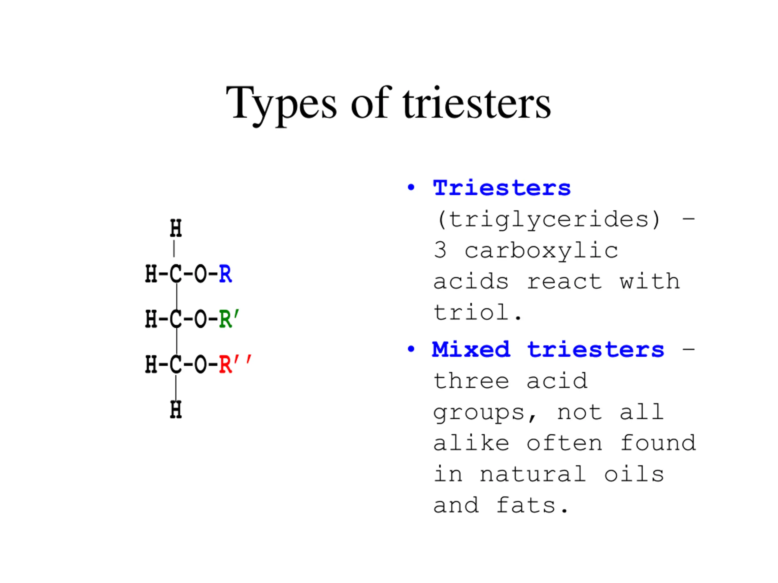 Types of triesters Triesters (triglycerides) 3 carboxylic acids react with triol. Mixed triesters three acid groups, not all alike often found in natural oils and fats. H H-C-O-R H-C-O-R H-C-O-R H