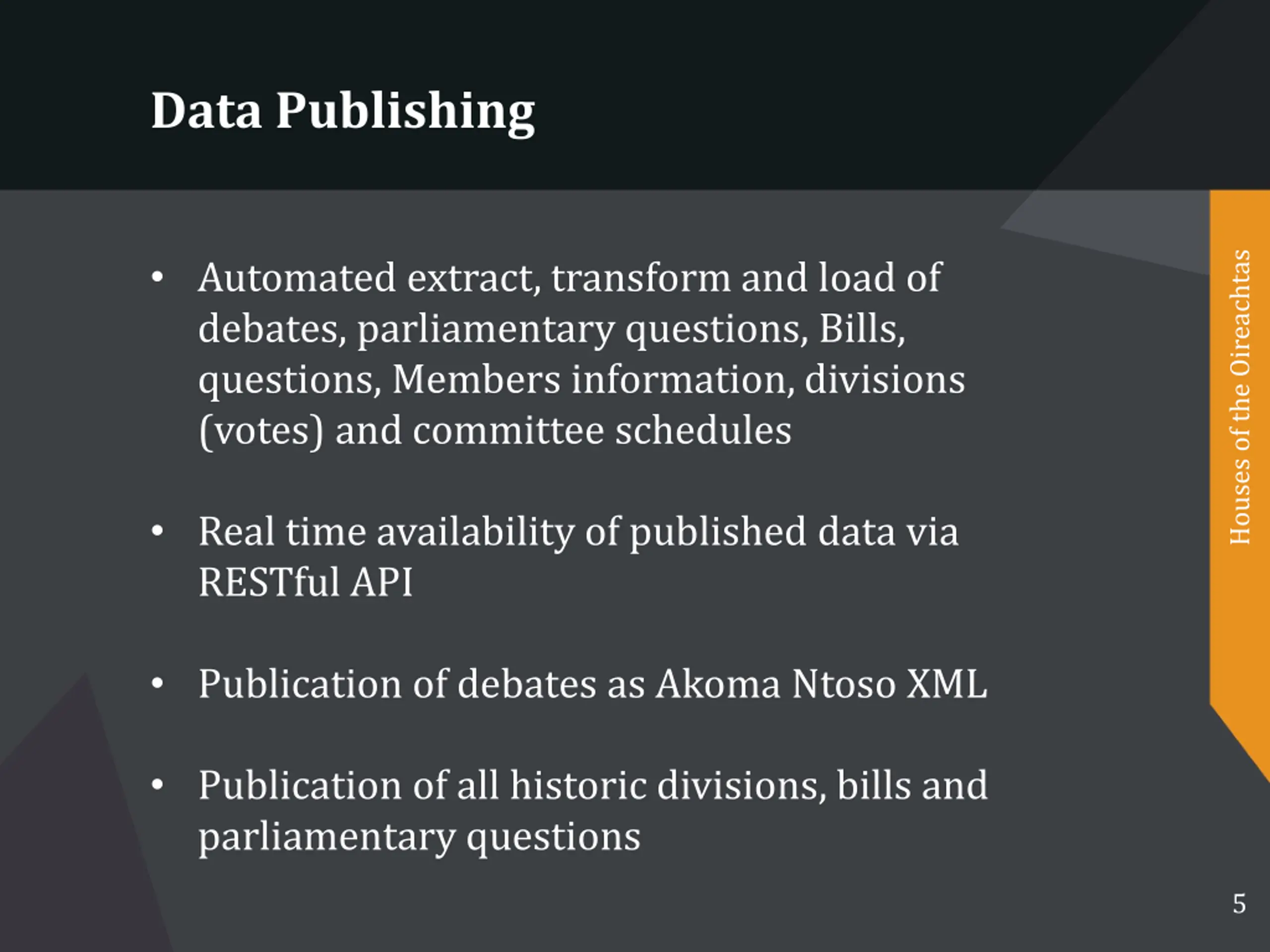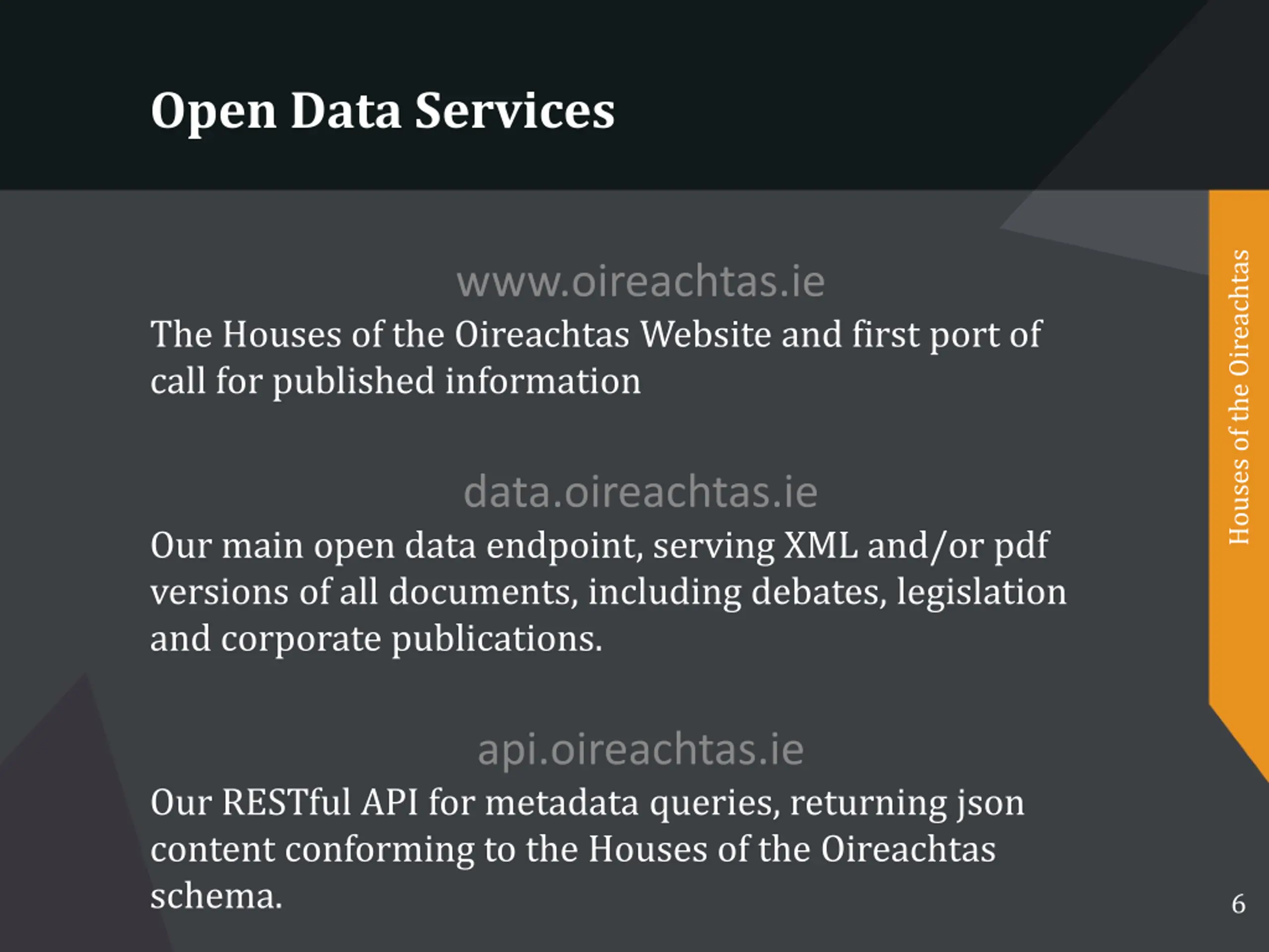 Data Publishing Houses of the Oireachtas Automated extract, transform and load of debates, parliamentary questions, Bills, questions, Members information, divisions (votes) and committee schedules Real time availability of published data via RESTful API Publication of debates as Akoma Ntoso XML Publication of all historic divisions, bills and parliamentary questions 5