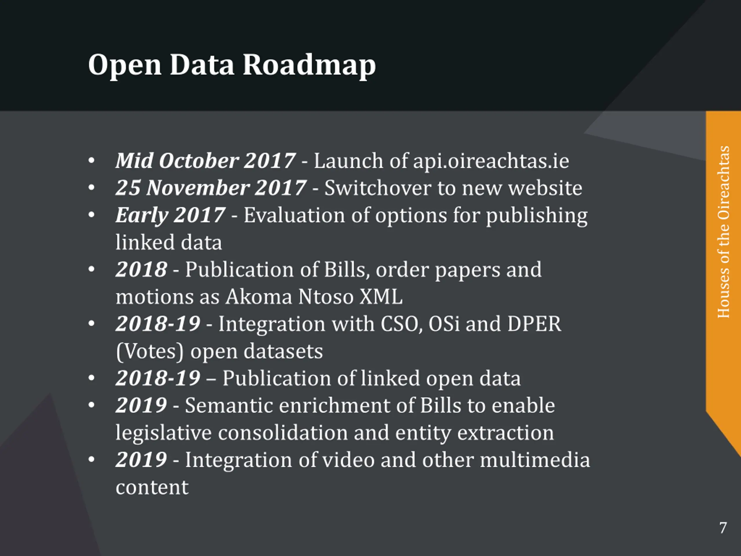 Open Data Roadmap Houses of the Oireachtas Mid October 2017 - Launch of api.oireachtas.ie 25 November 2017 - Switchover to new website Early 2017 - Evaluation of options for publishing linked data 2018 - Publication of Bills, order papers and motions as Akoma Ntoso XML 2018-19 - Integration with CSO, OSi and DPER (Votes) open datasets 2018-19 Publication of linked open data 2019 - Semantic enrichment of Bills to enable legislative consolidation and entity extraction 2019 - Integration of video and other multimedia content 7
