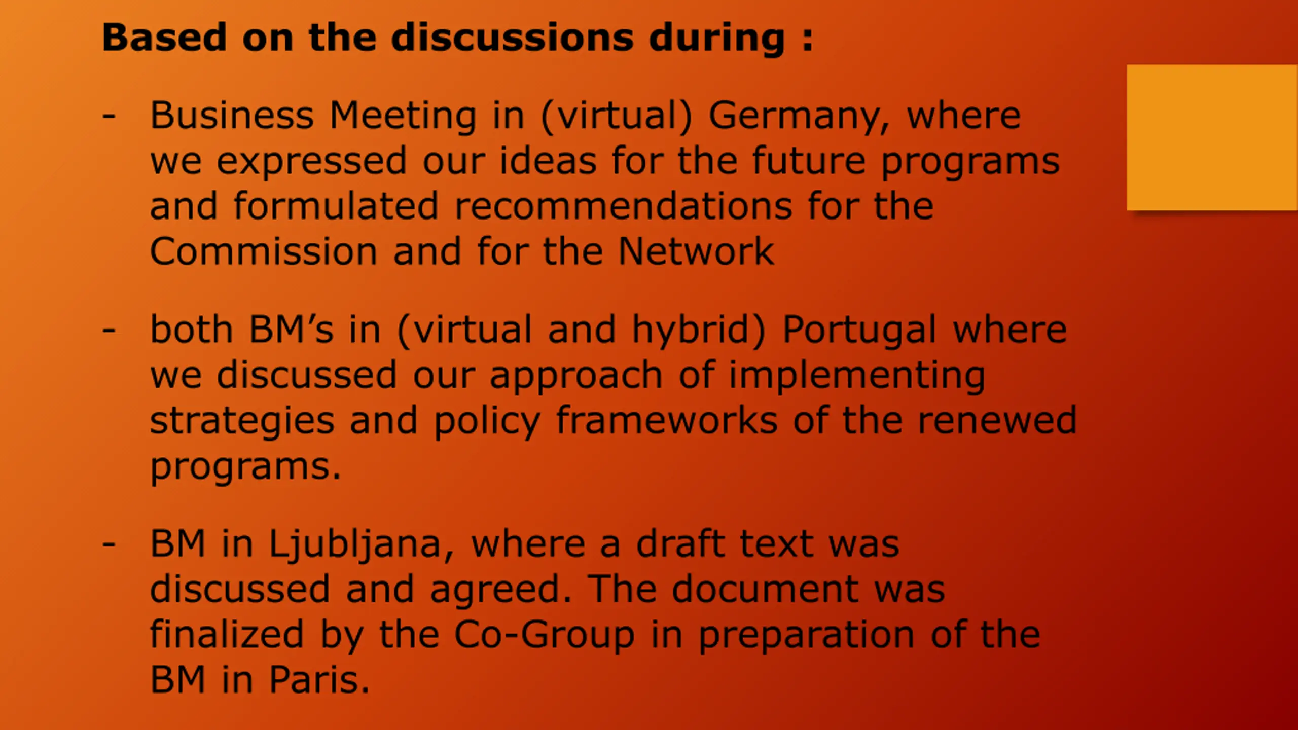 Based on the discussions during : - Business Meeting in (virtual) Germany, where we expressed our ideas for the future programs and formulated recommendations for the Commission and for the Network - both BM s in (virtual and hybrid) Portugal where we discussed our approach of implementing strategies and policy frameworks of the renewed programs. - BM in Ljubljana, where a draft text was discussed and agreed. The document was finalized by the Co-Group in preparation of the BM in Paris.