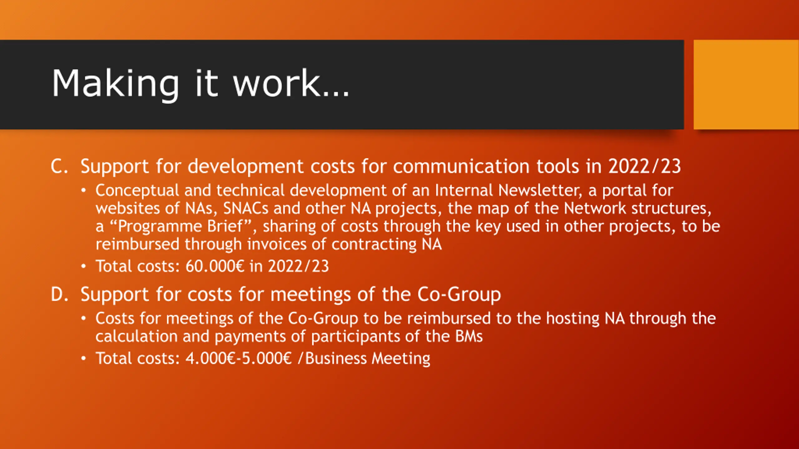 Making it work C. Support for development costs for communication tools in 2022/23 Conceptual and technical development of an Internal Newsletter, a portal for websites of NAs, SNACs and other NA projects, the map of the Network structures, a Programme Brief , sharing of costs through the key used in other projects, to be reimbursed through invoices of contracting NA Total costs: 60.000 in 2022/23 D. Support for costs for meetings of the Co-Group Costs for meetings of the Co-Group to be reimbursed to the hosting NA through the calculation and payments of participants of the BMs Total costs: 4.000 -5.000 /Business Meeting