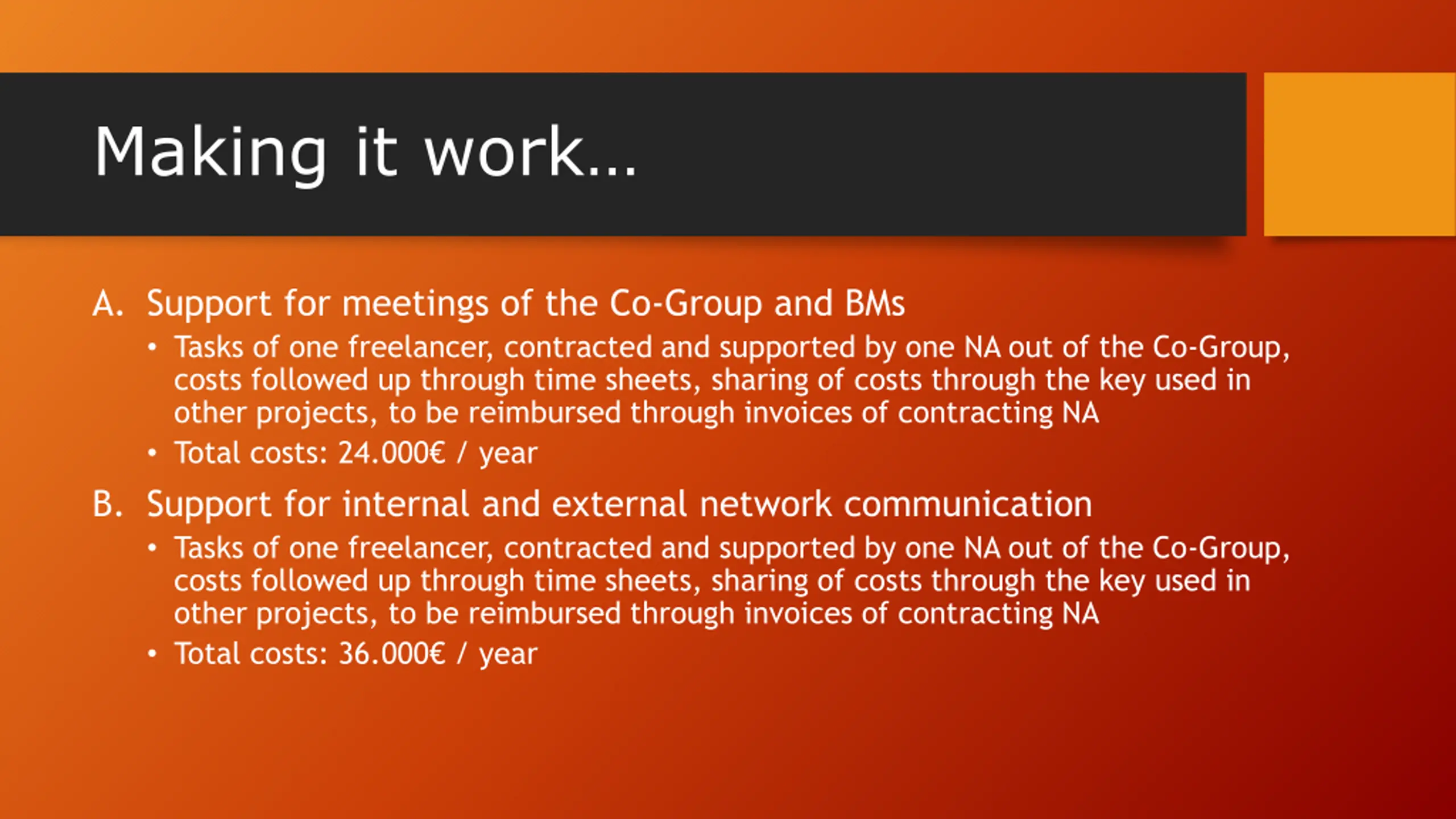 Making it work A. Support for meetings of the Co-Group and BMs Tasks of one freelancer, contracted and supported by one NA out of the Co-Group, costs followed up through time sheets, sharing of costs through the key used in other projects, to be reimbursed through invoices of contracting NA Total costs: 24.000 / year B. Support for internal and external network communication Tasks of one freelancer, contracted and supported by one NA out of the Co-Group, costs followed up through time sheets, sharing of costs through the key used in other projects, to be reimbursed through invoices of contracting NA Total costs: 36.000 / year