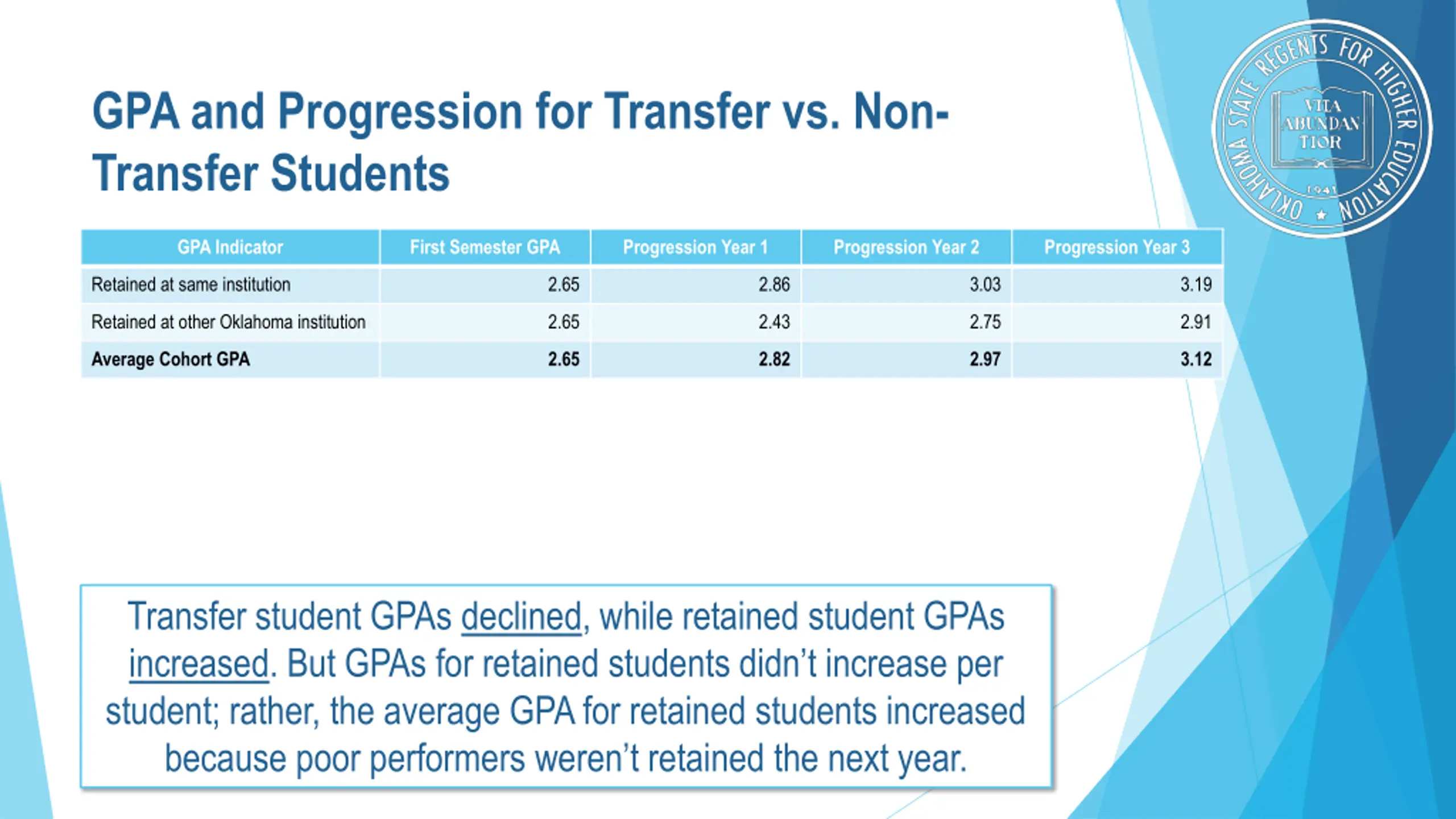 GPA and Progression for Transfer vs. Non- Transfer Students GPA Indicator First Semester GPA Progression Year 1 Progression Year 2 Progression Year 3 Retained at same institution 2.65 2.86 3.03 3.19 Retained at other Oklahoma institution 2.65 2.43 2.75 2.91 Average Cohort GPA 2.65 2.82 2.97 3.12 Transfer student GPAs declined, while retained student GPAs increased. But GPAs for retained students didn t increase per student; rather, the average GPA for retained students increased because poor performers weren t retained the next year.