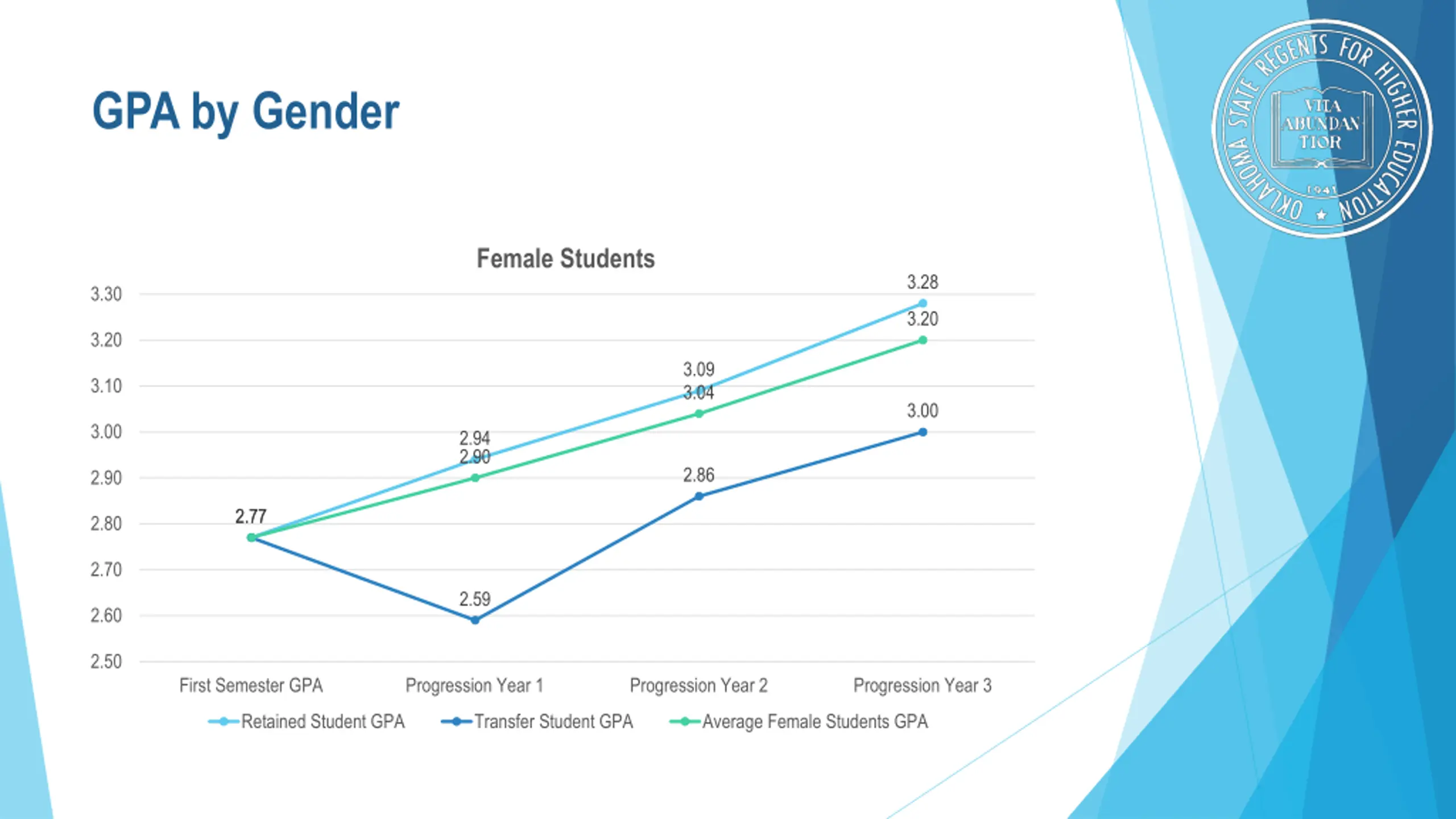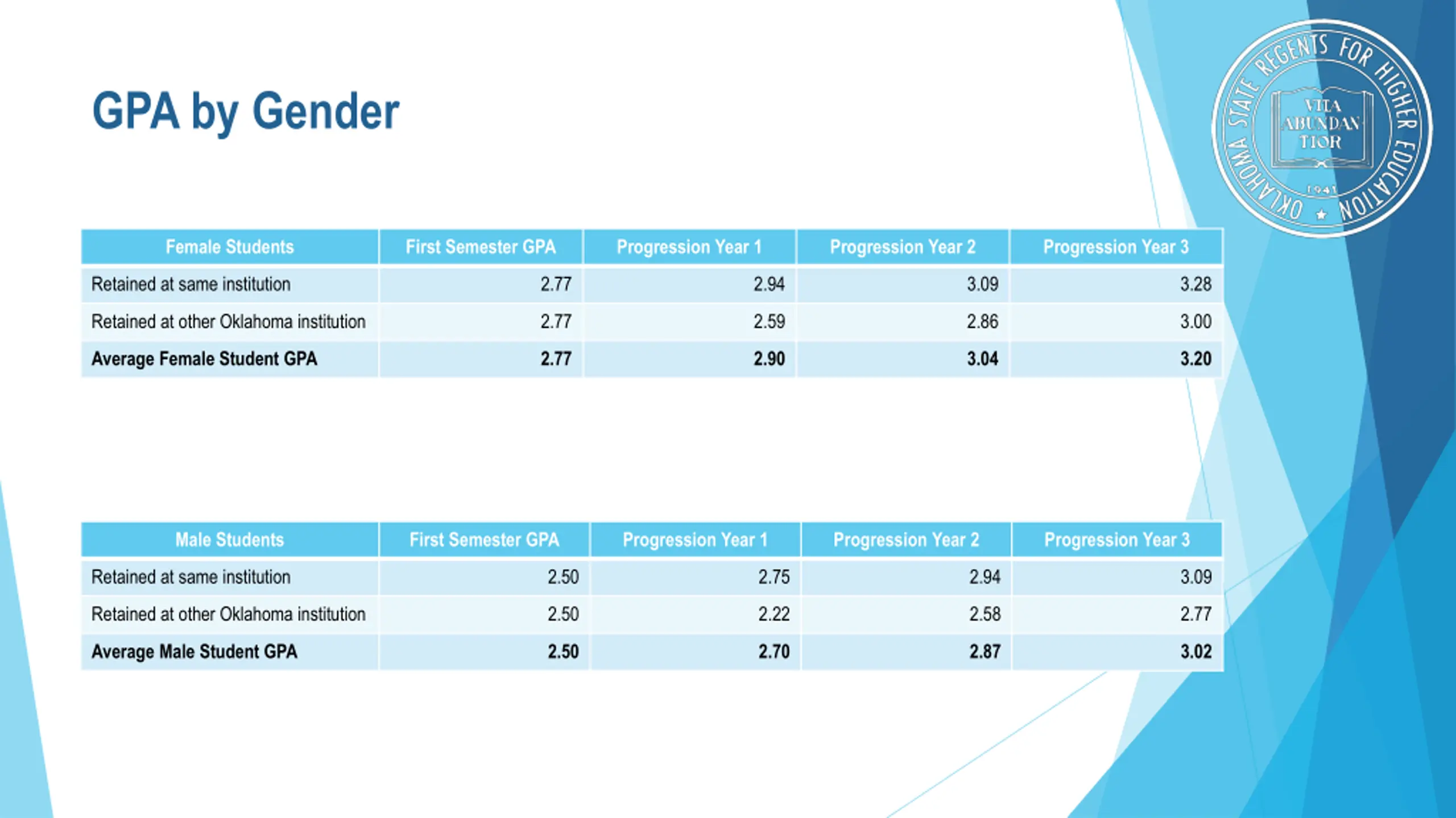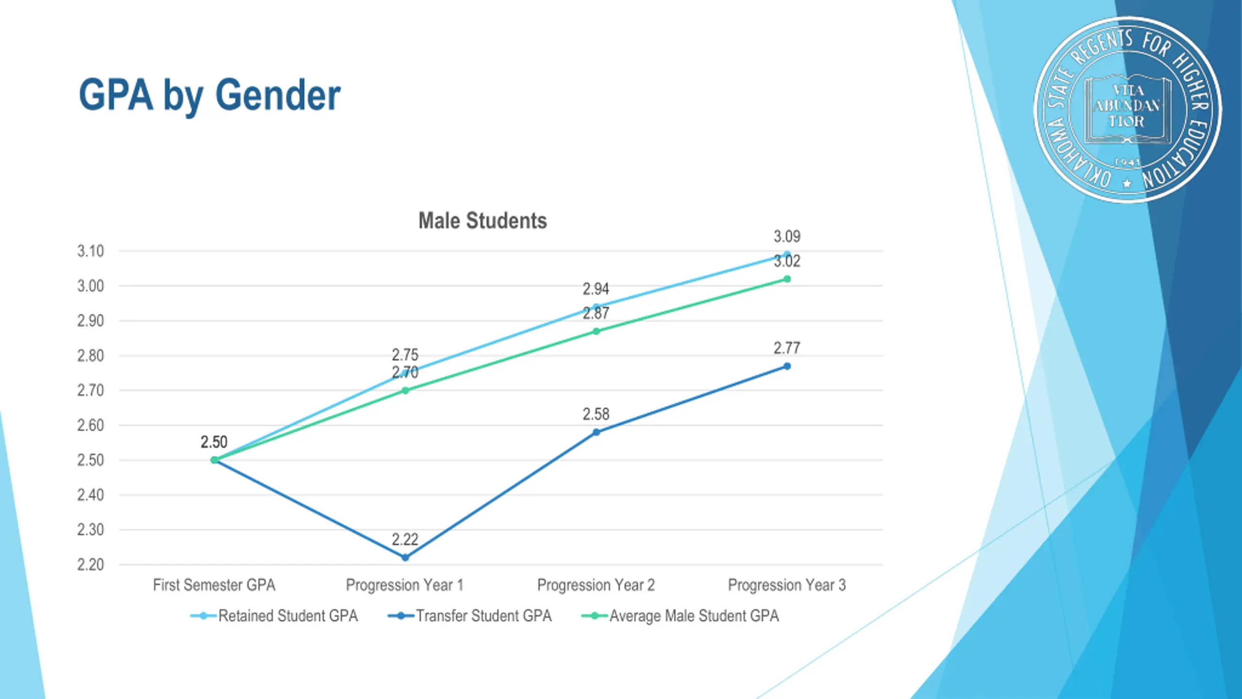GPA by Gender Female Students First Semester GPA Progression Year 1 Progression Year 2 Progression Year 3 Retained at same institution 2.77 2.94 3.09 3.28 Retained at other Oklahoma institution 2.77 2.59 2.86 3.00 Average Female Student GPA 2.77 2.90 3.04 3.20 Male Students First Semester GPA Progression Year 1 Progression Year 2 Progression Year 3 Retained at same institution 2.50 2.75 2.94 3.09 Retained at other Oklahoma institution 2.50 2.22 2.58 2.77 Average Male Student GPA 2.50 2.70 2.87 3.02