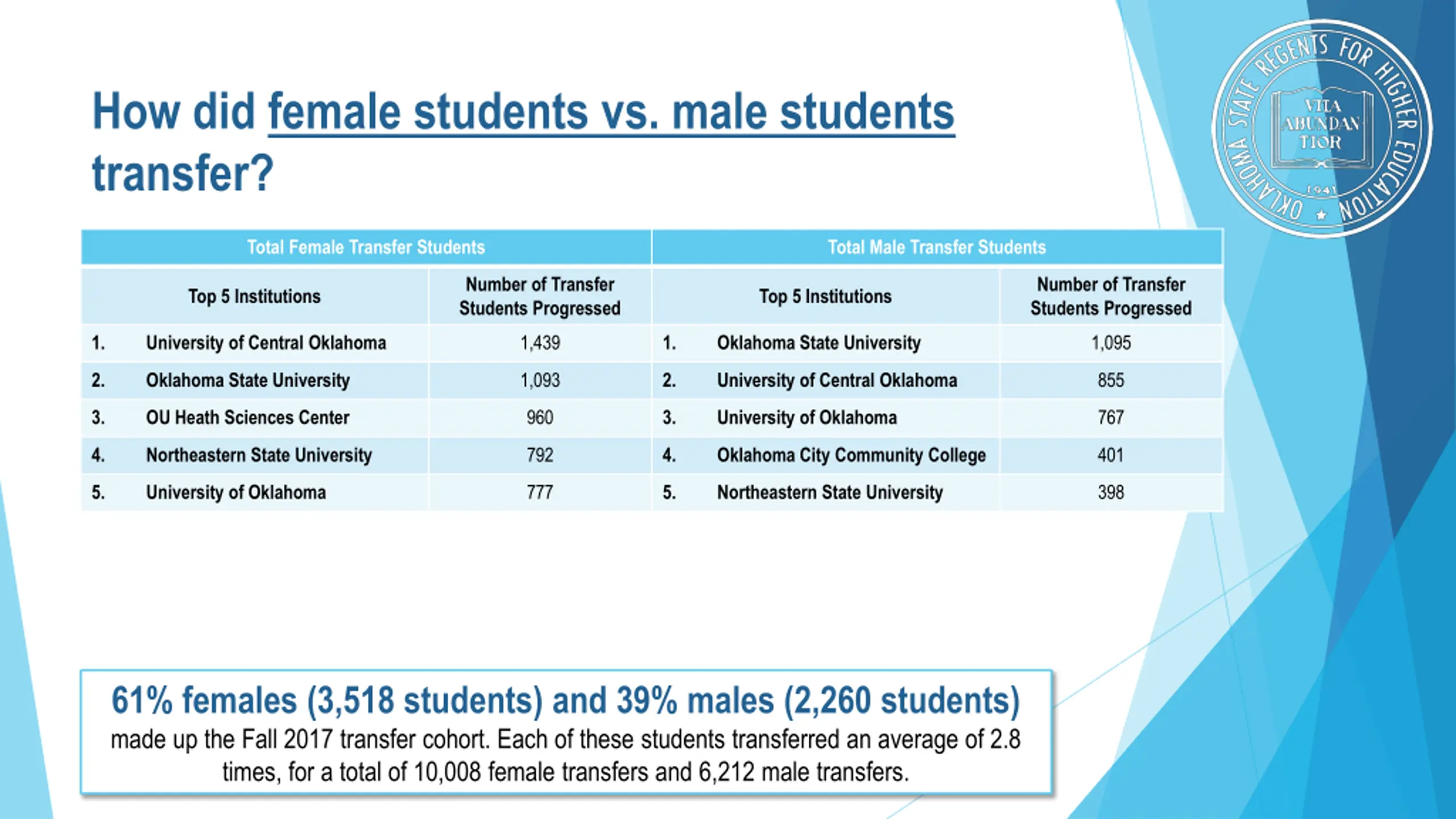 How did female students vs. male students transfer? Total Female Transfer Students Total Male Transfer Students Number of Transfer Students Progressed Number of Transfer Students Progressed Top 5 Institutions Top 5 Institutions 1. University of Central Oklahoma 1,439 1. Oklahoma State University 1,095 2. Oklahoma State University 1,093 2. University of Central Oklahoma 855 3. OU Heath Sciences Center 960 3. University of Oklahoma 767 4. Northeastern State University 792 4. Oklahoma City Community College 401 5. University of Oklahoma 777 5. Northeastern State University 398 61% females (3,518 students) and 39% males (2,260 students) made up the Fall 2017 transfer cohort. Each of these students transferred an average of 2.8 times, for a total of 10,008 female transfers and 6,212 male transfers.