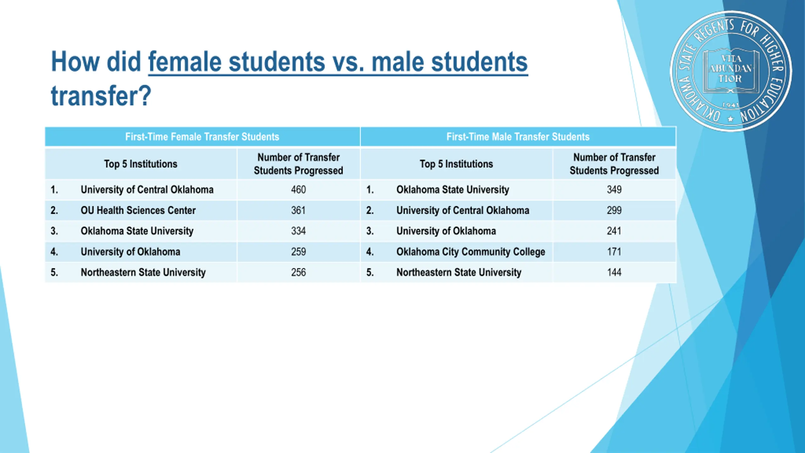 How did female students vs. male students transfer? First-Time Female Transfer Students First-Time Male Transfer Students Number of Transfer Students Progressed Number of Transfer Students Progressed Top 5 Institutions Top 5 Institutions 1. University of Central Oklahoma 460 1. Oklahoma State University 349 2. OU Health Sciences Center 361 2. University of Central Oklahoma 299 3. Oklahoma State University 334 3. University of Oklahoma 241 4. University of Oklahoma 259 4. Oklahoma City Community College 171 5. Northeastern State University 256 5. Northeastern State University 144