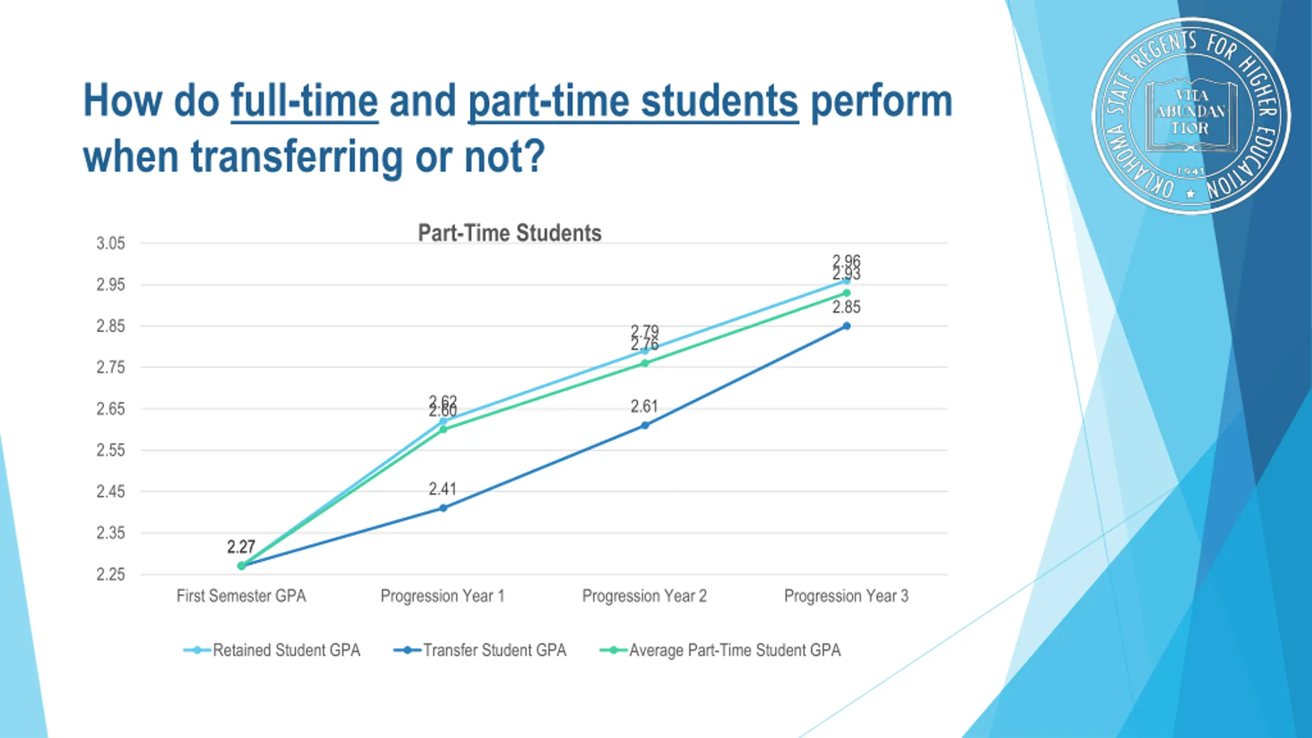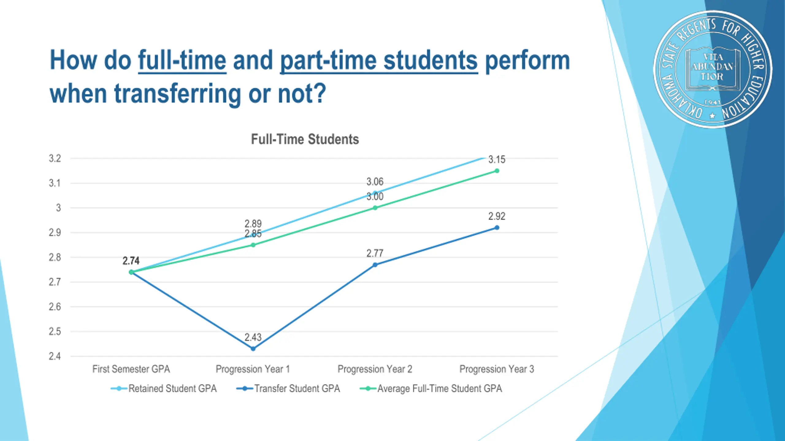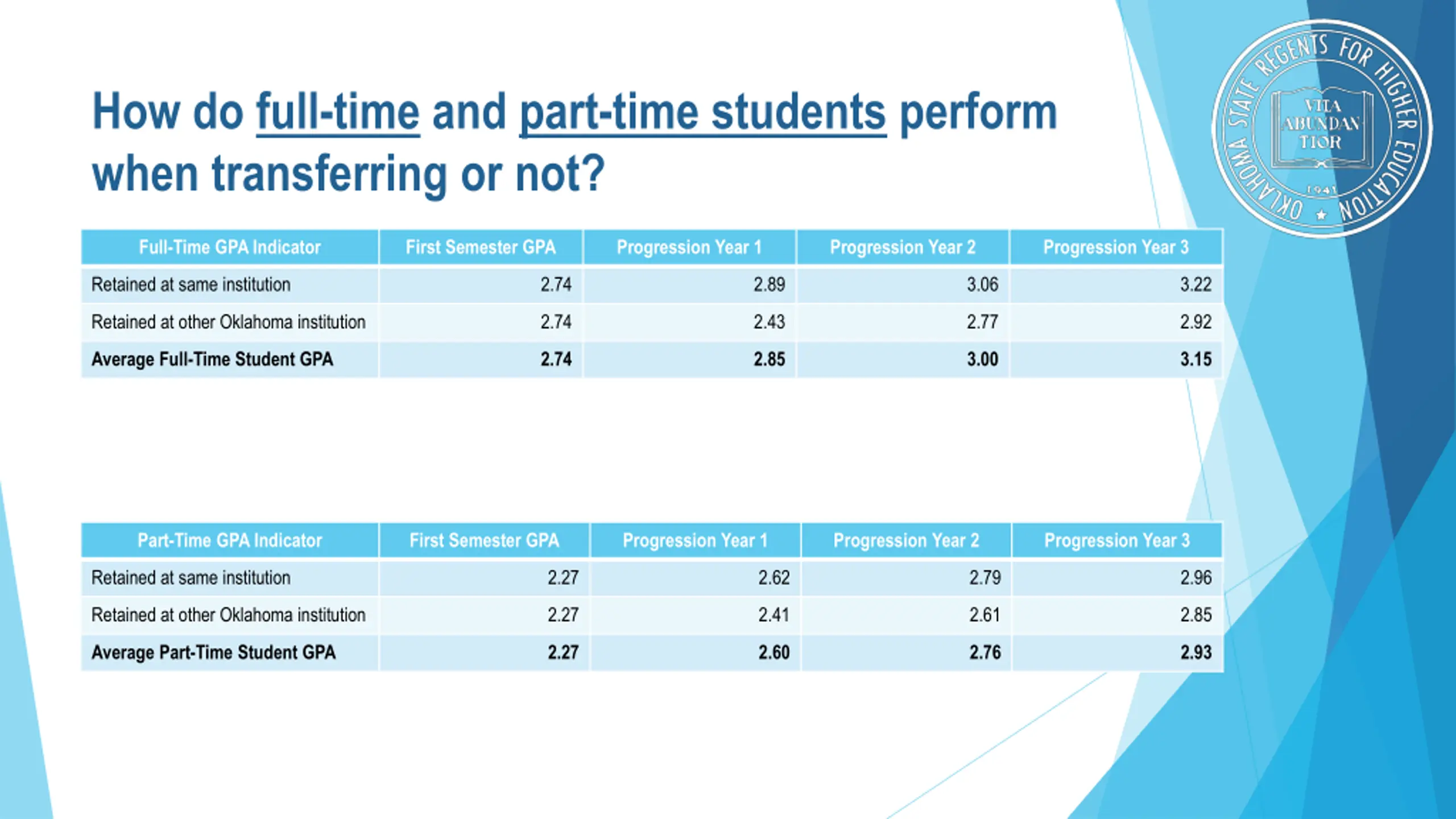 How do full-time and part-time students perform when transferring or not? Full-Time GPA Indicator First Semester GPA Progression Year 1 Progression Year 2 Progression Year 3 Retained at same institution 2.74 2.89 3.06 3.22 Retained at other Oklahoma institution 2.74 2.43 2.77 2.92 Average Full-Time Student GPA 2.74 2.85 3.00 3.15 Part-Time GPA Indicator First Semester GPA Progression Year 1 Progression Year 2 Progression Year 3 Retained at same institution 2.27 2.62 2.79 2.96 Retained at other Oklahoma institution 2.27 2.41 2.61 2.85 Average Part-Time Student GPA 2.27 2.60 2.76 2.93