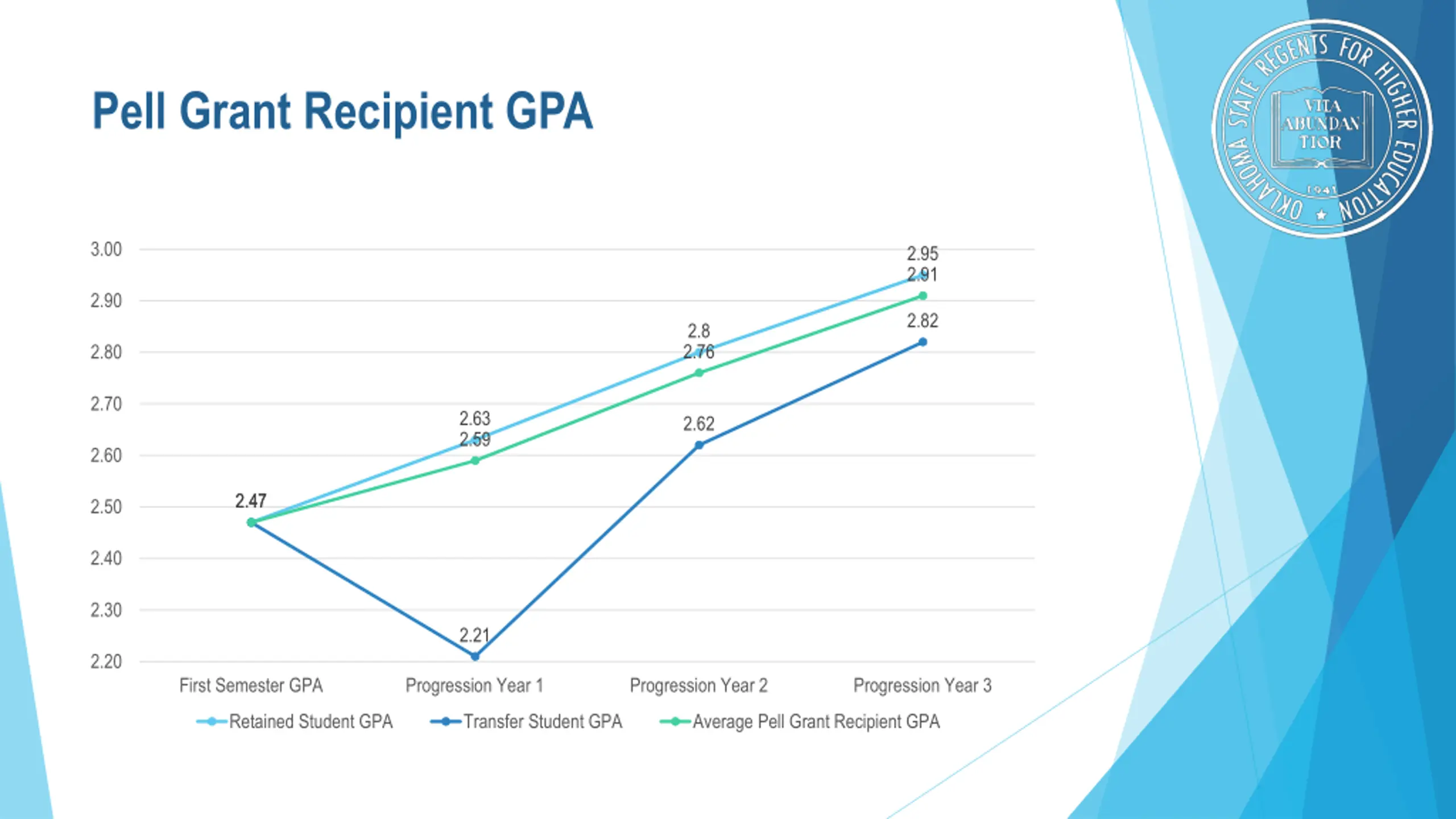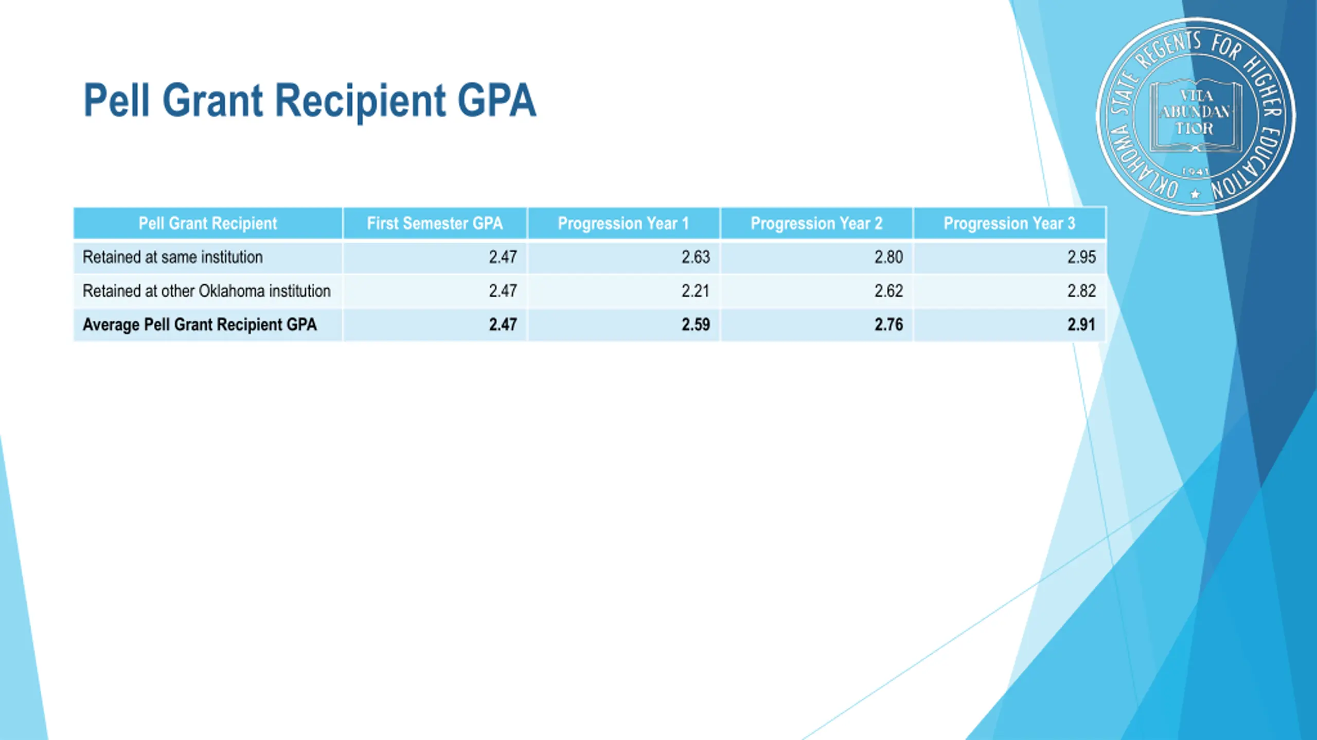 Pell Grant Recipient GPA Pell Grant Recipient First Semester GPA Progression Year 1 Progression Year 2 Progression Year 3 Retained at same institution 2.47 2.63 2.80 2.95 Retained at other Oklahoma institution 2.47 2.21 2.62 2.82 Average Pell Grant Recipient GPA 2.47 2.59 2.76 2.91