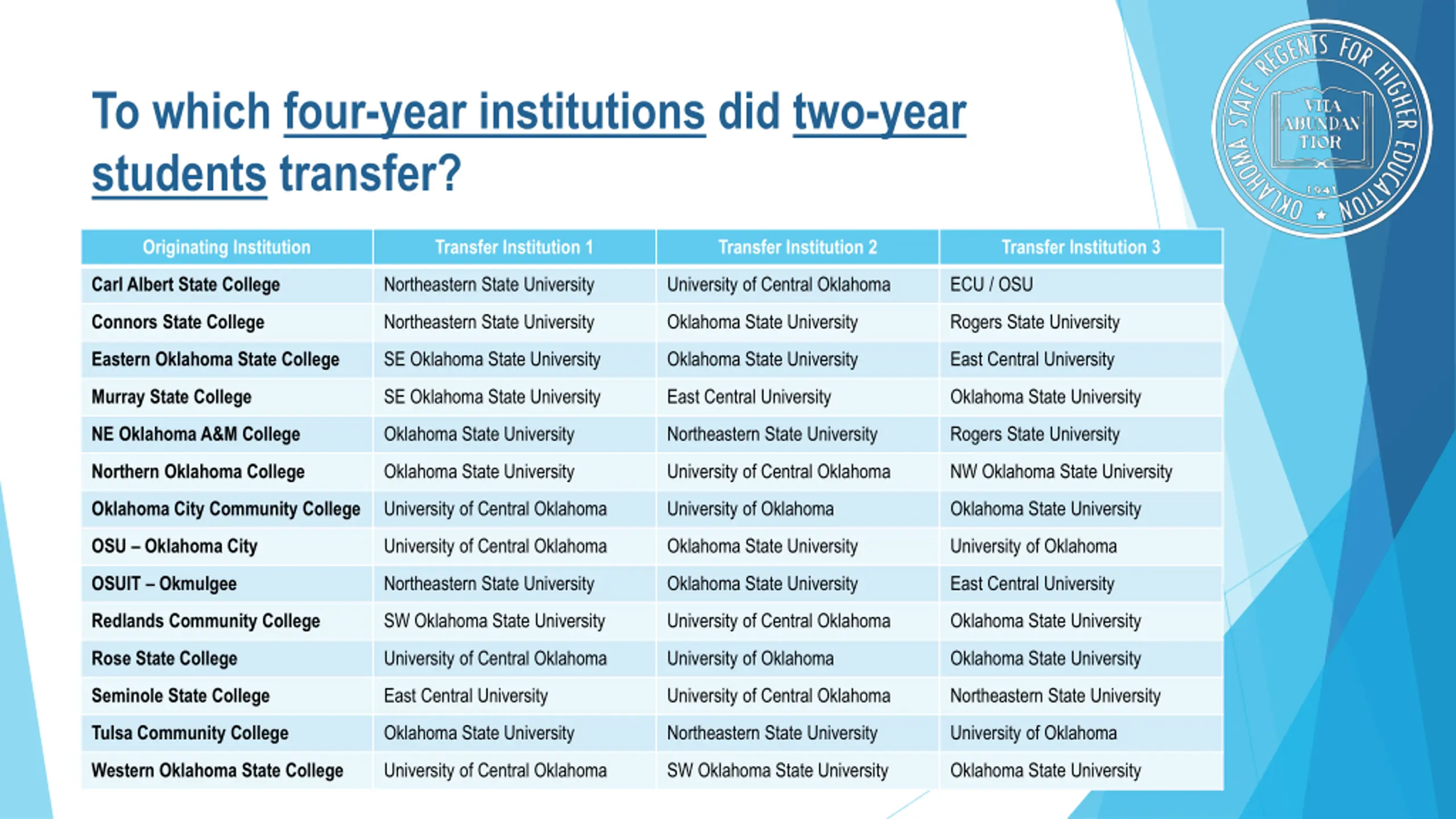 To which four-year institutions did two-year students transfer? Originating Institution Transfer Institution 1 Transfer Institution 2 Transfer Institution 3 Carl Albert State College Northeastern State University University of Central Oklahoma ECU / OSU Connors State College Northeastern State University Oklahoma State University Rogers State University Eastern Oklahoma State College SE Oklahoma State University Oklahoma State University East Central University Murray State College SE Oklahoma State University East Central University Oklahoma State University NE Oklahoma A&M College Oklahoma State University Northeastern State University Rogers State University Northern Oklahoma College Oklahoma State University University of Central Oklahoma NW Oklahoma State University Oklahoma City Community College University of Central Oklahoma University of Oklahoma Oklahoma State University OSU Oklahoma City University of Central Oklahoma Oklahoma State University University of Oklahoma OSUIT Okmulgee Northeastern State University Oklahoma State University East Central University Redlands Community College SW Oklahoma State University University of Central Oklahoma Oklahoma State University Rose State College University of Central Oklahoma University of Oklahoma Oklahoma State University Seminole State College East Central University University of Central Oklahoma Northeastern State University Tulsa Community College Oklahoma State University Northeastern State University University of Oklahoma Western Oklahoma State College University of Central Oklahoma SW Oklahoma State University Oklahoma State University