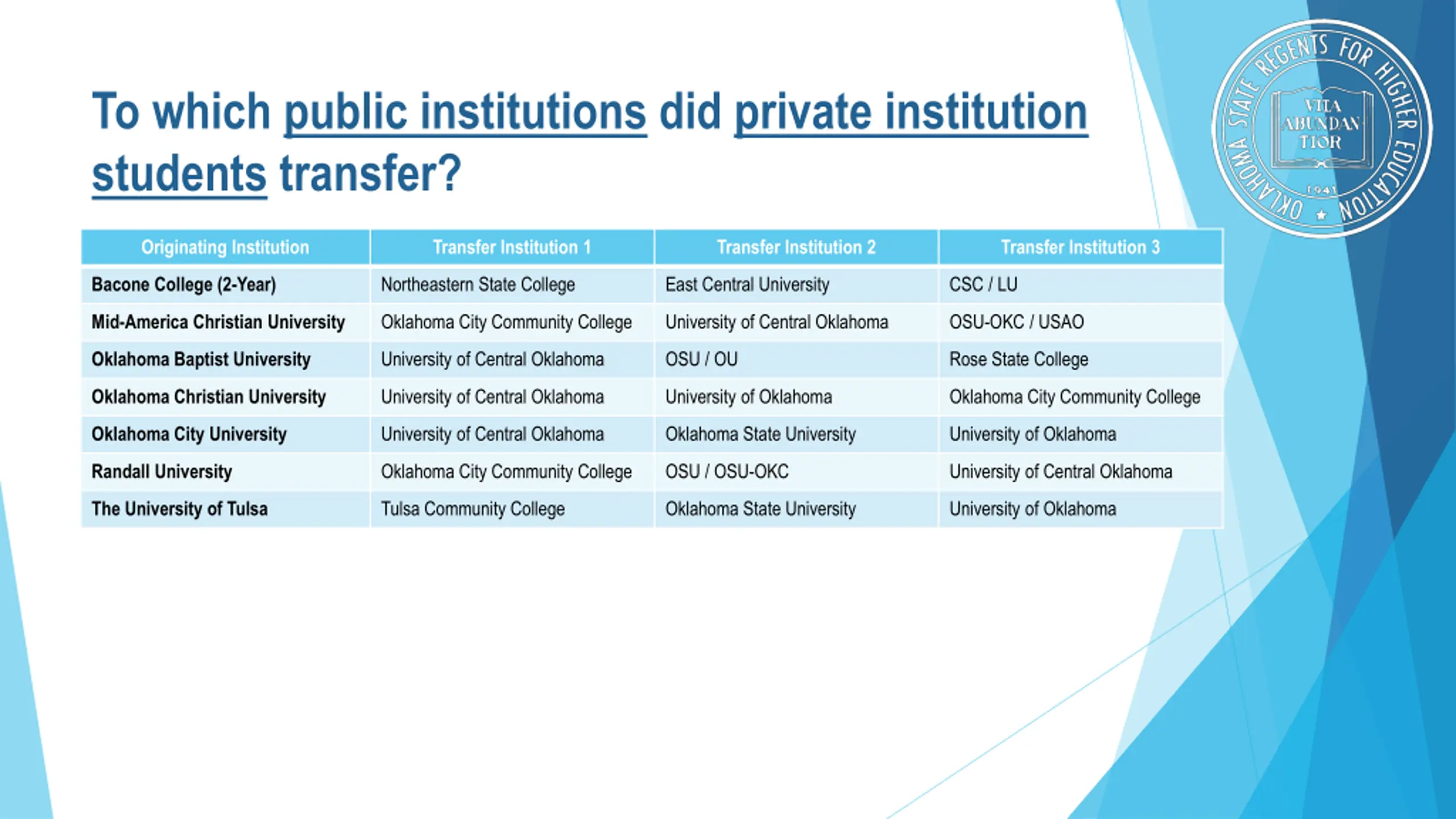 To which public institutions did private institution students transfer? Originating Institution Transfer Institution 1 Transfer Institution 2 Transfer Institution 3 Bacone College (2-Year) Northeastern State College East Central University CSC / LU Mid-America Christian University Oklahoma City Community College University of Central Oklahoma OSU-OKC / USAO Oklahoma Baptist University University of Central Oklahoma OSU / OU Rose State College Oklahoma Christian University University of Central Oklahoma University of Oklahoma Oklahoma City Community College Oklahoma City University University of Central Oklahoma Oklahoma State University University of Oklahoma Randall University Oklahoma City Community College OSU / OSU-OKC University of Central Oklahoma The University of Tulsa Tulsa Community College Oklahoma State University University of Oklahoma