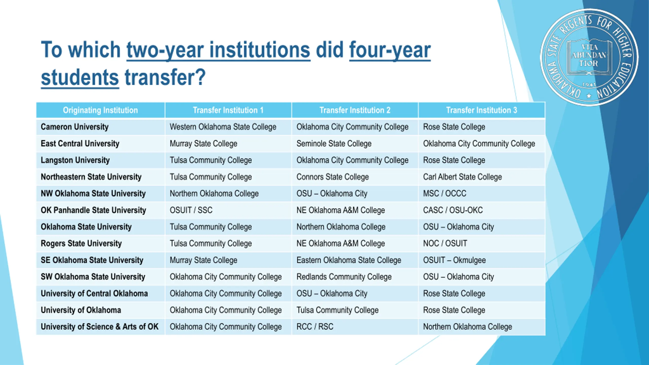 To which two-year institutions did four-year students transfer? Originating Institution Transfer Institution 1 Transfer Institution 2 Transfer Institution 3 Cameron University Western Oklahoma State College Oklahoma City Community College Rose State College East Central University Murray State College Seminole State College Oklahoma City Community College Langston University Tulsa Community College Oklahoma City Community College Rose State College Northeastern State University Tulsa Community College Connors State College Carl Albert State College NW Oklahoma State University Northern Oklahoma College OSU Oklahoma City MSC / OCCC OK Panhandle State University OSUIT / SSC NE Oklahoma A&M College CASC / OSU-OKC Oklahoma State University Tulsa Community College Northern Oklahoma College OSU Oklahoma City Rogers State University Tulsa Community College NE Oklahoma A&M College NOC / OSUIT SE Oklahoma State University Murray State College Eastern Oklahoma State College OSUIT Okmulgee SW Oklahoma State University Oklahoma City Community College Redlands Community College OSU Oklahoma City University of Central Oklahoma Oklahoma City Community College OSU Oklahoma City Rose State College University of Oklahoma Oklahoma City Community College Tulsa Community College Rose State College University of Science & Arts of OK Oklahoma City Community College RCC / RSC Northern Oklahoma College
