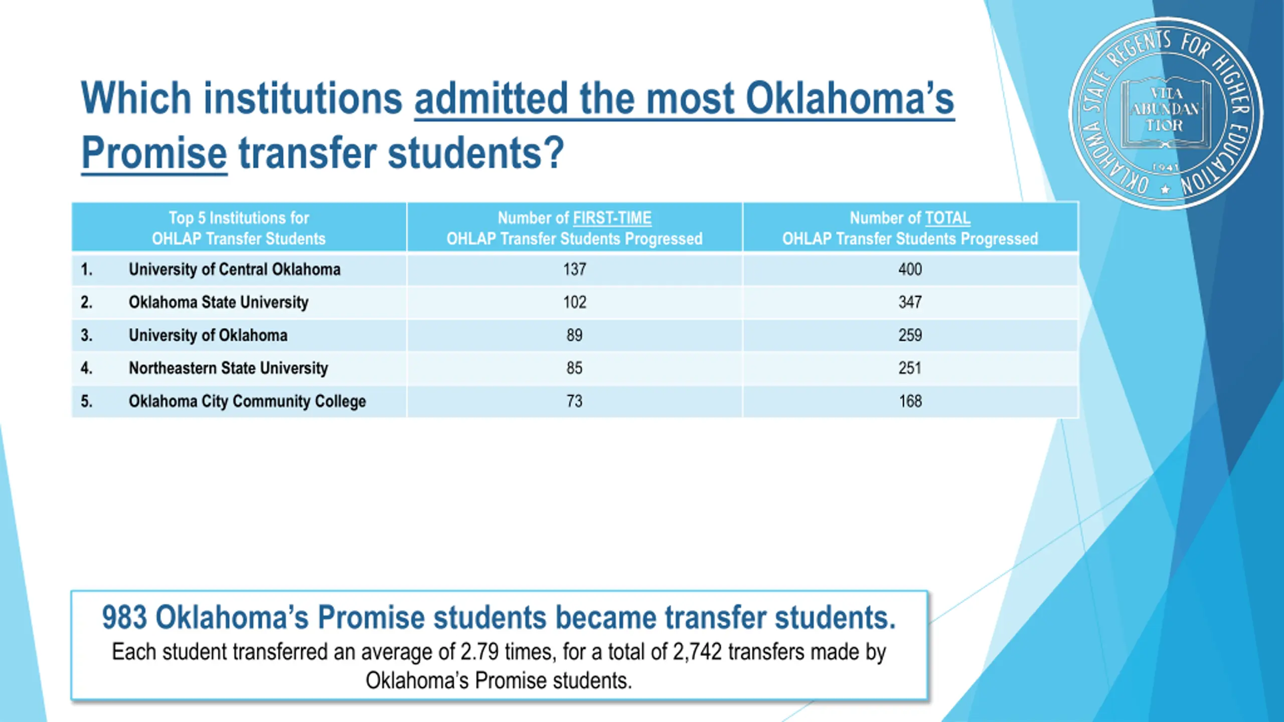 Which institutions admitted the most Oklahomas Promise transfer students? Top 5 Institutions for OHLAP Transfer Students Number of FIRST-TIME OHLAP Transfer Students Progressed Number of TOTAL OHLAP Transfer Students Progressed 1. University of Central Oklahoma 137 400 2. Oklahoma State University 102 347 3. University of Oklahoma 89 259 4. Northeastern State University 85 251 5. Oklahoma City Community College 73 168 983 Oklahoma s Promise students became transfer students. Each student transferred an average of 2.79 times, for a total of 2,742 transfers made by Oklahoma s Promise students.