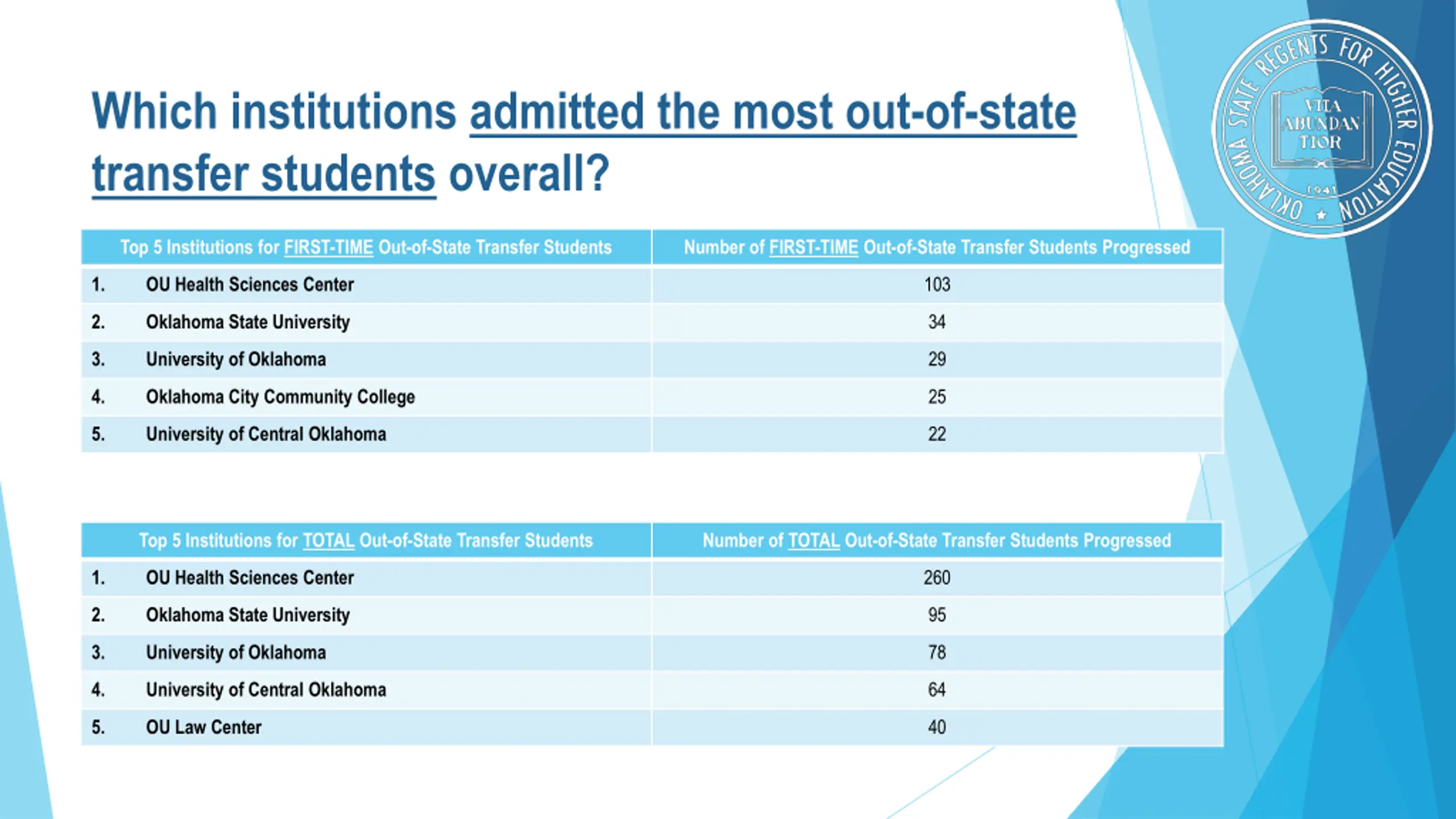 Which institutions admitted the most out-of-state transfer students overall? Top 5 Institutions for FIRST-TIME Out-of-State Transfer Students Number of FIRST-TIME Out-of-State Transfer Students Progressed 1. OU Health Sciences Center 103 2. Oklahoma State University 34 3. University of Oklahoma 29 4. Oklahoma City Community College 25 5. University of Central Oklahoma 22 Top 5 Institutions for TOTAL Out-of-State Transfer Students Number of TOTAL Out-of-State Transfer Students Progressed 1. OU Health Sciences Center 260 2. Oklahoma State University 95 3. University of Oklahoma 78 4. University of Central Oklahoma 64 5. OU Law Center 40