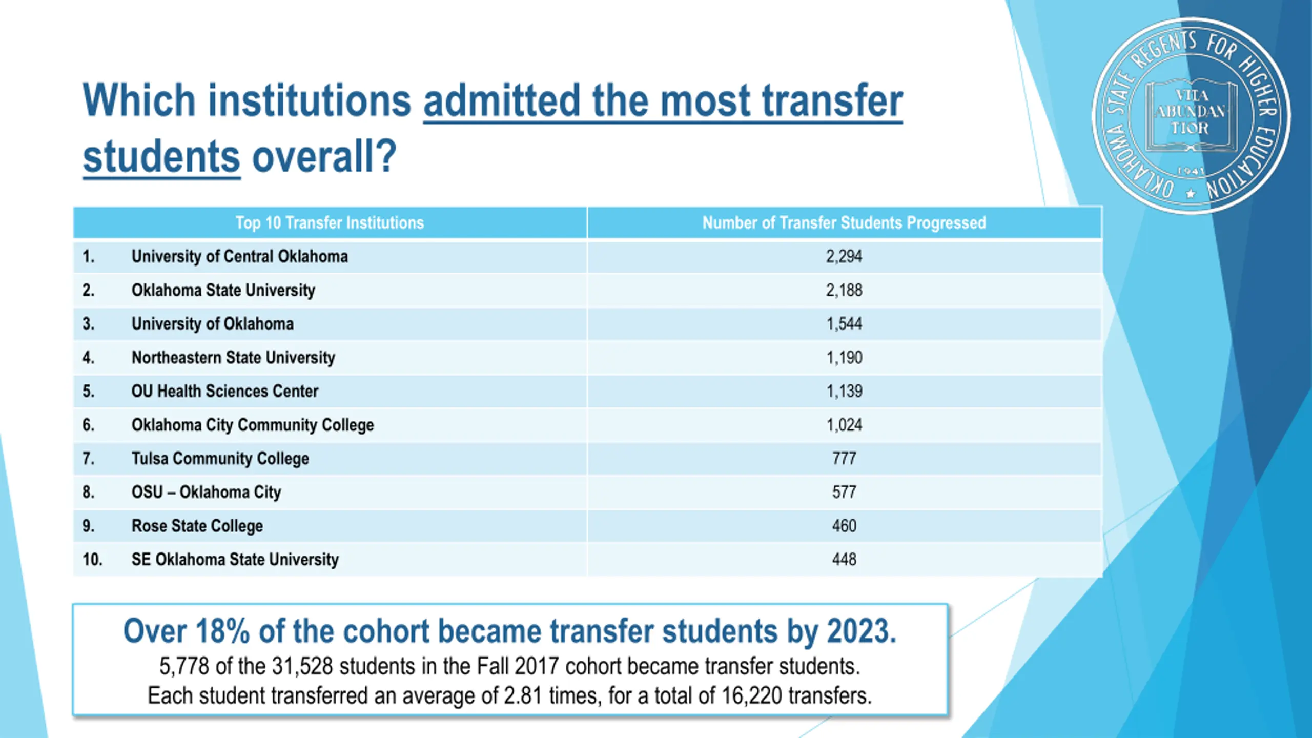 Which institutions admitted the most transfer students overall? Top 10 Transfer Institutions Number of Transfer Students Progressed 1. University of Central Oklahoma 2,294 2. Oklahoma State University 2,188 3. University of Oklahoma 1,544 4. Northeastern State University 1,190 5. OU Health Sciences Center 1,139 6. Oklahoma City Community College 1,024 7. Tulsa Community College 777 8. OSU Oklahoma City 577 9. Rose State College 460 10. SE Oklahoma State University 448 Over 18% of the cohort became transfer students by 2023. 5,778 of the 31,528 students in the Fall 2017 cohort became transfer students. Each student transferred an average of 2.81 times, for a total of 16,220 transfers.