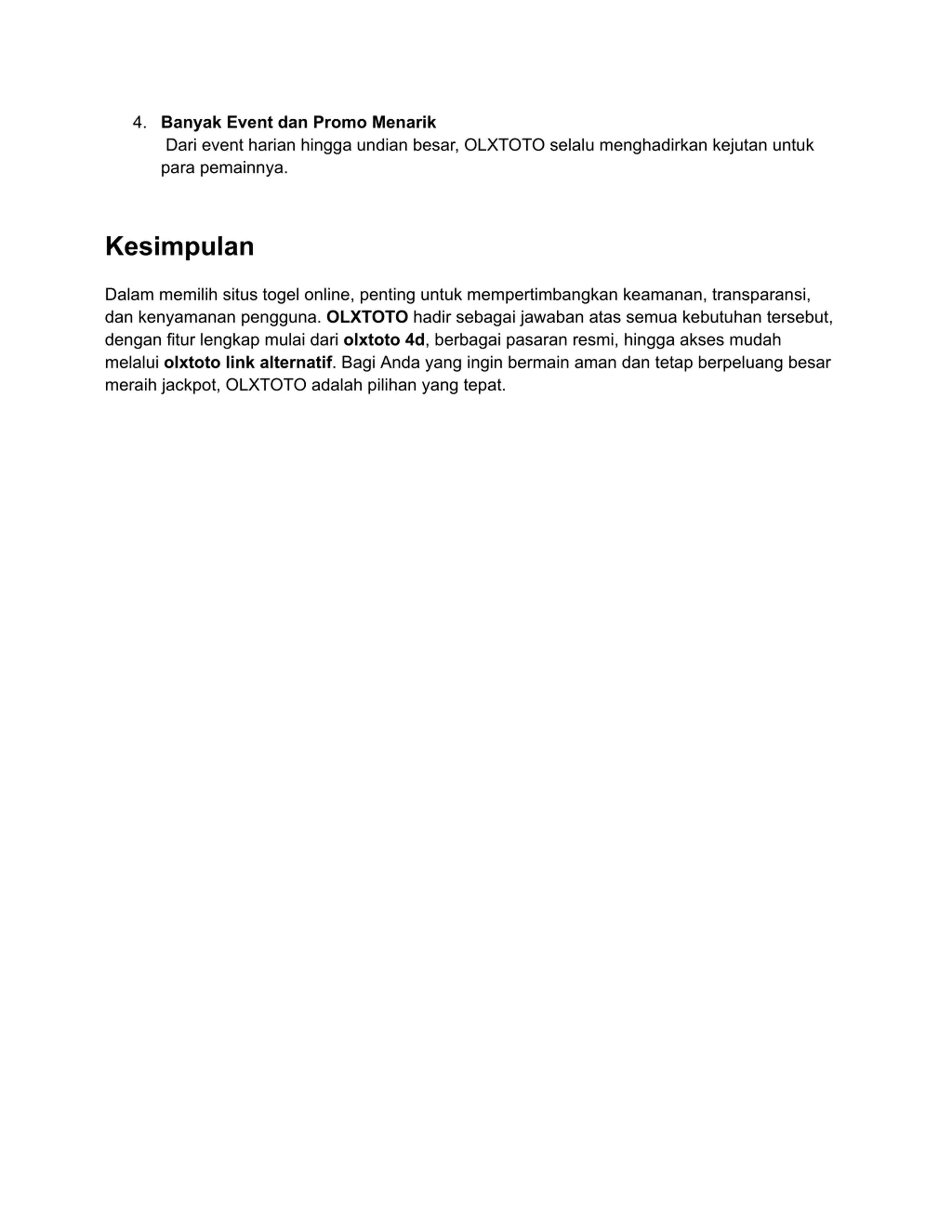 4. Banyak Event dan Promo Menarik Dari event harian hingga undian besar, OLXTOTO selalu menghadirkan kejutan untuk para pemainnya. Kesimpulan Dalam memilih situs togel online, penting untuk mempertimbangkan keamanan, transparansi, dan kenyamanan pengguna. OLXTOTO hadir sebagai jawaban atas semua kebutuhan tersebut, dengan fitur lengkap mulai dari olxtoto 4d, berbagai pasaran resmi, hingga akses mudah melalui olxtoto link alternatif. Bagi Anda yang ingin bermain aman dan tetap berpeluang besar meraih jackpot, OLXTOTO adalah pilihan yang tepat.